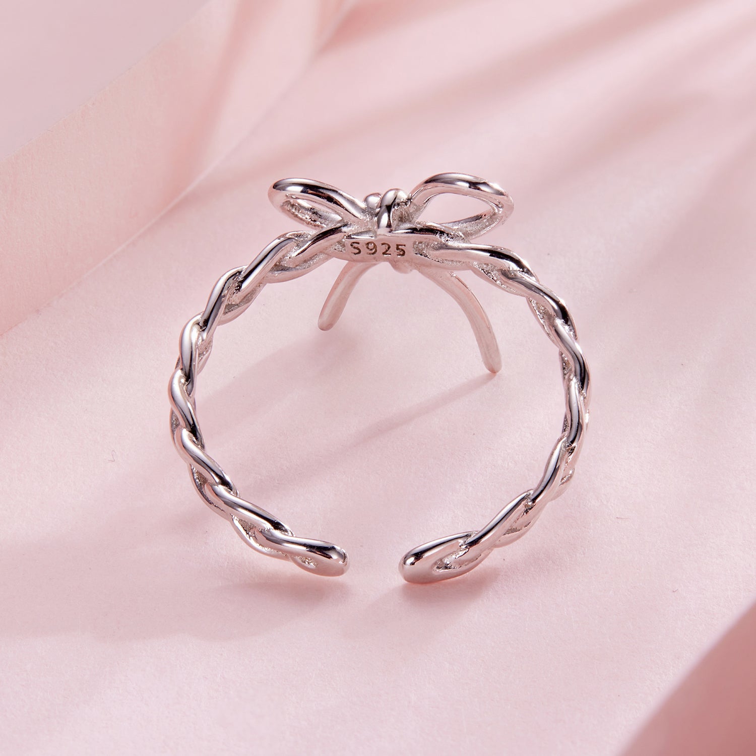 A delicate silver ring in the shape of a intertwined bow is a symbol of tenderness, femininity and romance. Its open design with a braided effect easily adapts to any finger size and adds a light, playful touch to your look. A perfect gift for a loved one or for yourself.