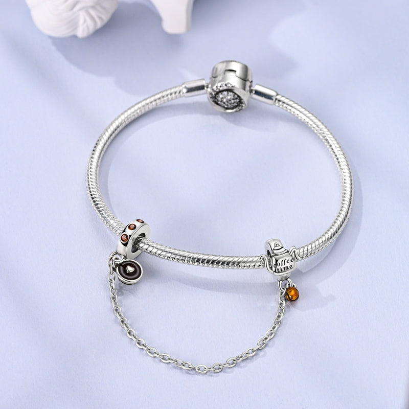 This adorable safety chain will protect your bracelet from accidental opening and add a touch of coffee to your everyday style. On one end of the chain is a coffee cup, on the other a teapot with the words "coffee time" and a coffee bean. Brown zirconias add a warm accent to the pendant.