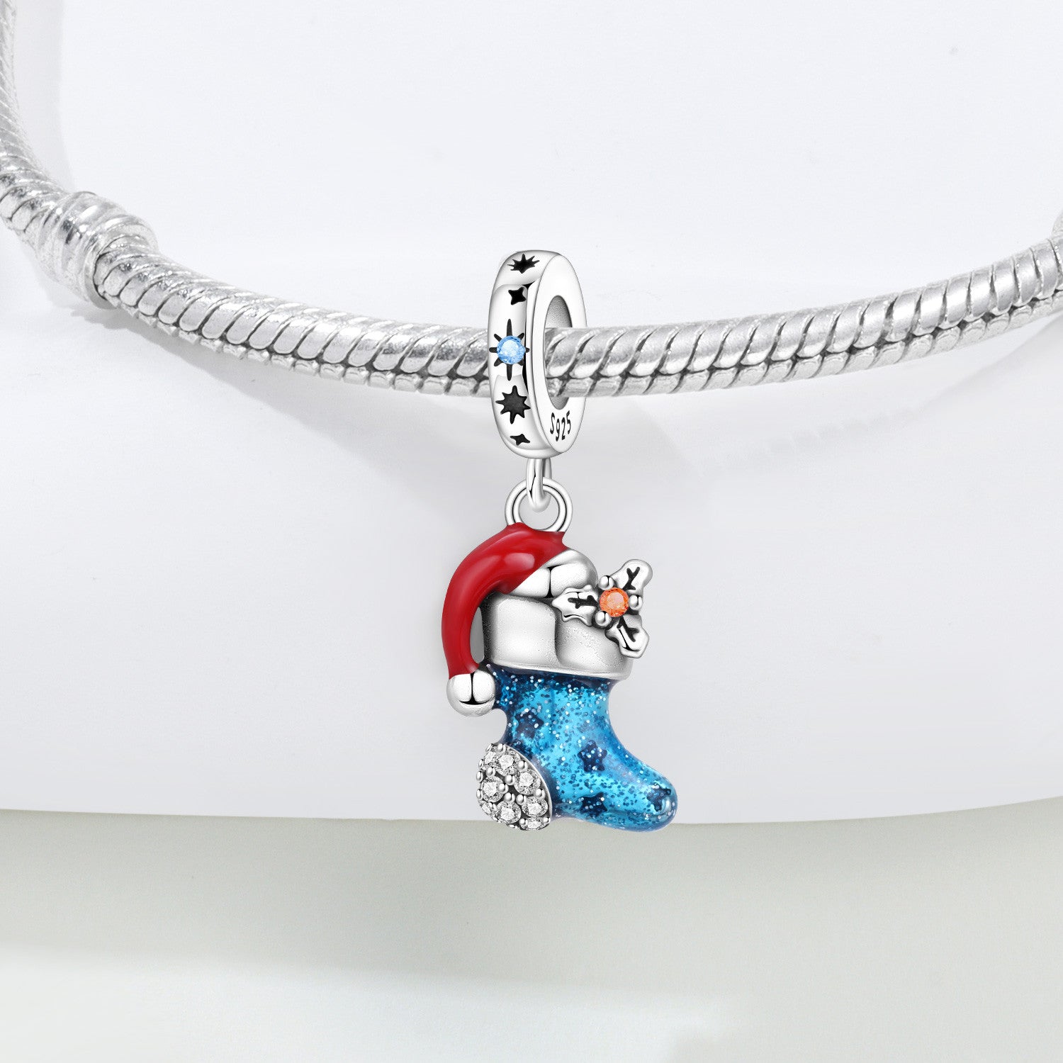 Táto trblietavá vianočná čižmička so Santovou čiapkou prinesie na váš náramok tú pravú sviatočnú atmosféru. Zimná modrá farba s jemným glitrovaným efektom pripomína mrazivú noc, zatiaľ čo červená čiapka a malý vianočný detail dodávajú šperku hravosť a teplo. Tento prívesok je dokonalým doplnkom pre milovníčky Vianoc a zimnej mágie.