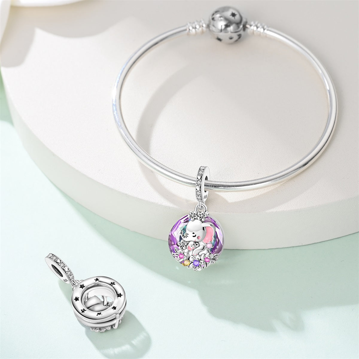 A love that knows no bounds. This touching sterling silver pendant captures a tender moment between a mother and her baby elephant, surrounded by pastel flowers and set in a purple faceted crystal. Pink and purple enamel adds a touch of softness, while vibrantly colored rhinestones add a touch of magic.