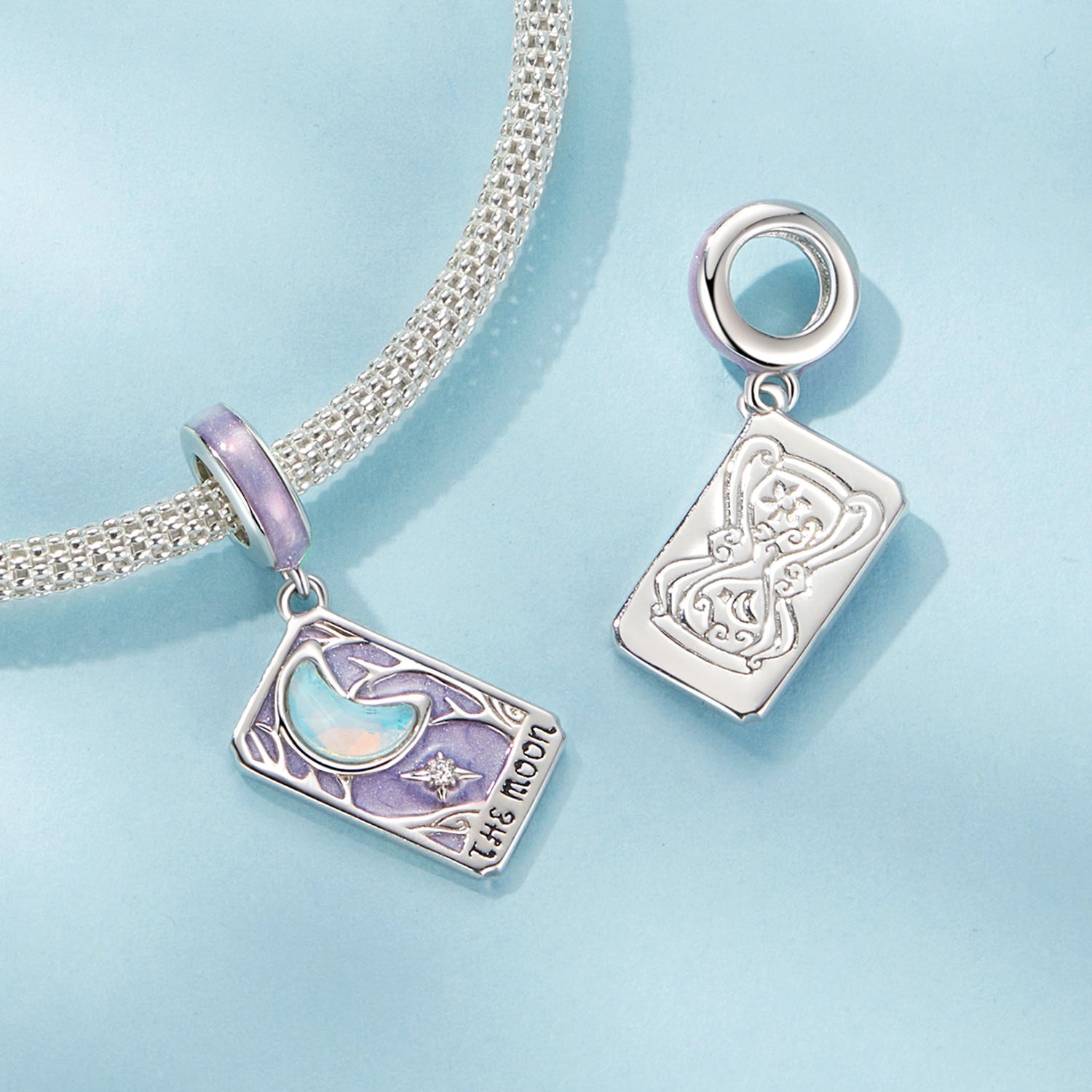 A mysterious silver pendant inspired by the tarot card "Moon" symbolizes intuition, dreams and hidden messages. Its enchanting purple enamel and delicate engraved details create a mystical atmosphere. The main element is a radiant moon with an opalite effect, which gives the pendant an ethereal shine. Made of 925 silver, this pendant is the ideal talisman for those who believe in magic and a deep connection with the universe.