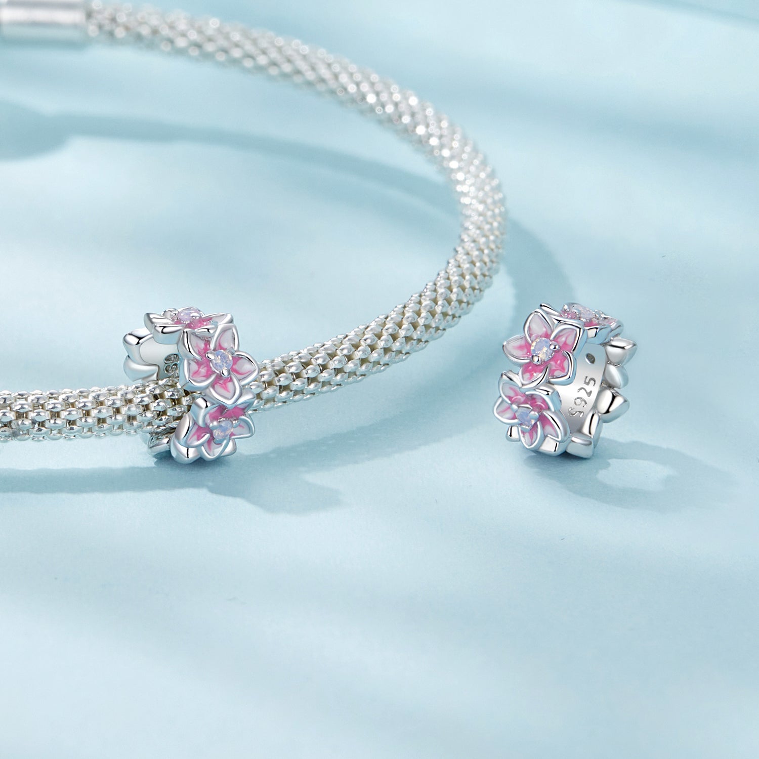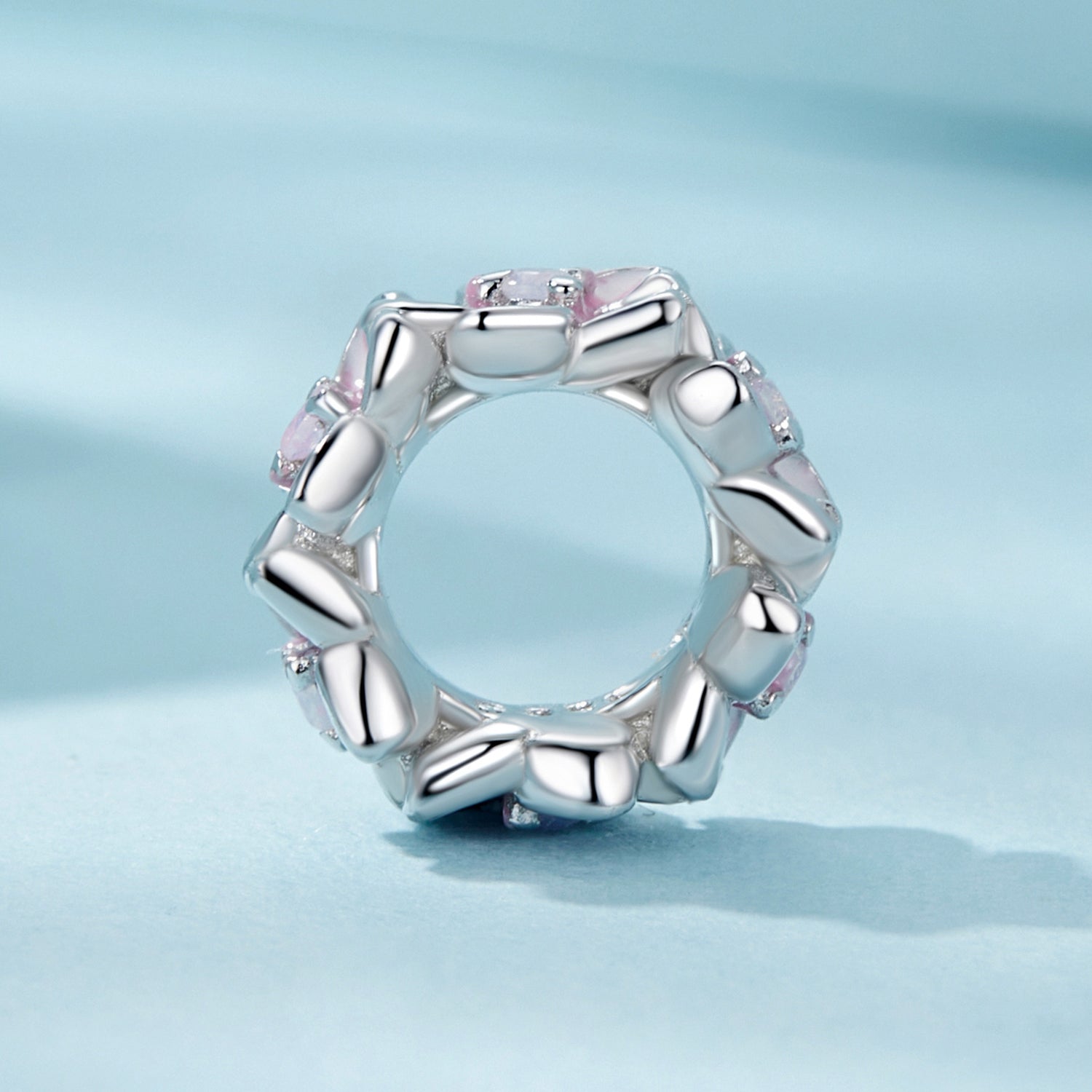 Delicate silver pendant in the shape of flowers intertwined into a belt. The flowers are decorated with pink glaze and small clear crystals, which give them a delicate shine. It symbolizes femininity, beauty and freshness. A great accessory for Pandora bracelets.