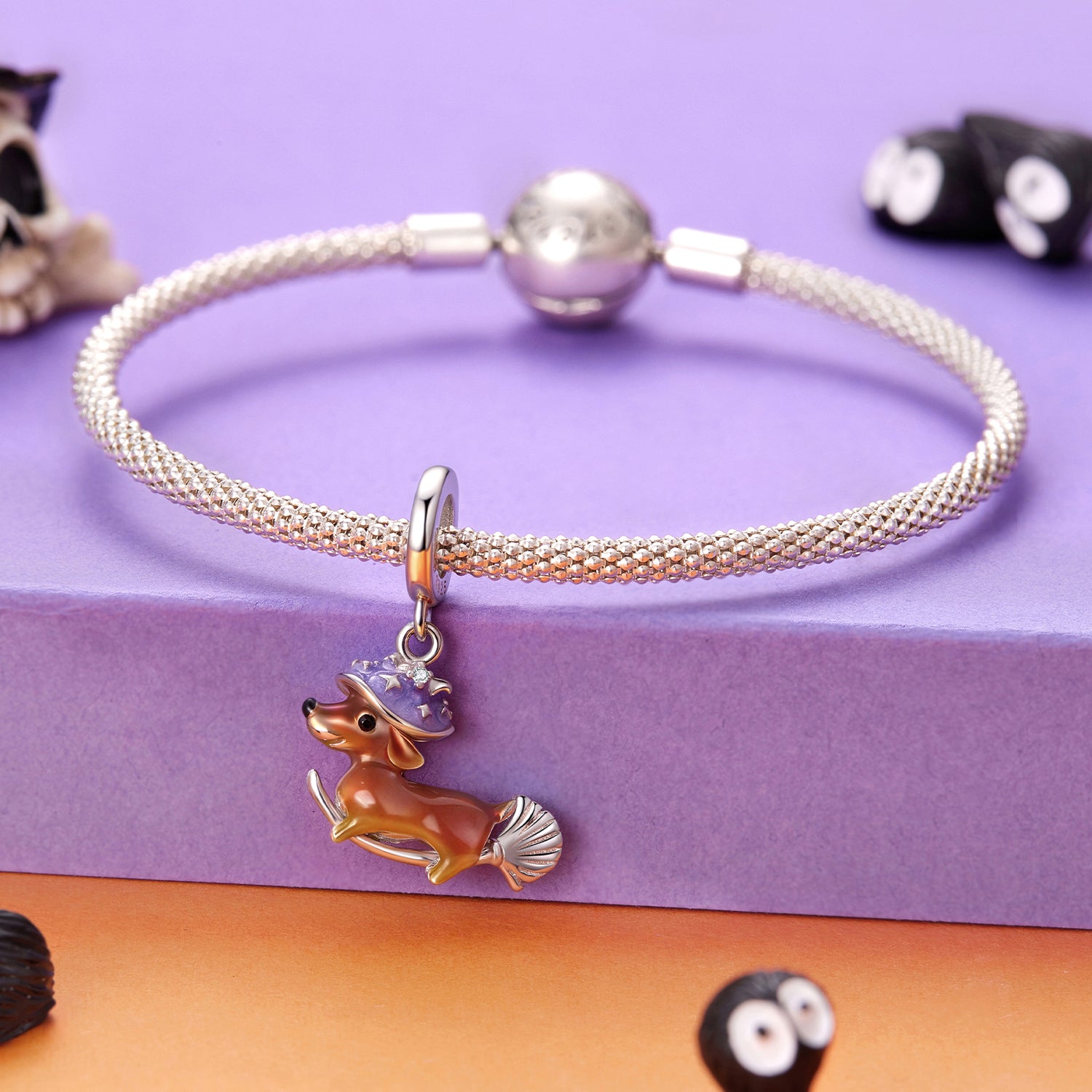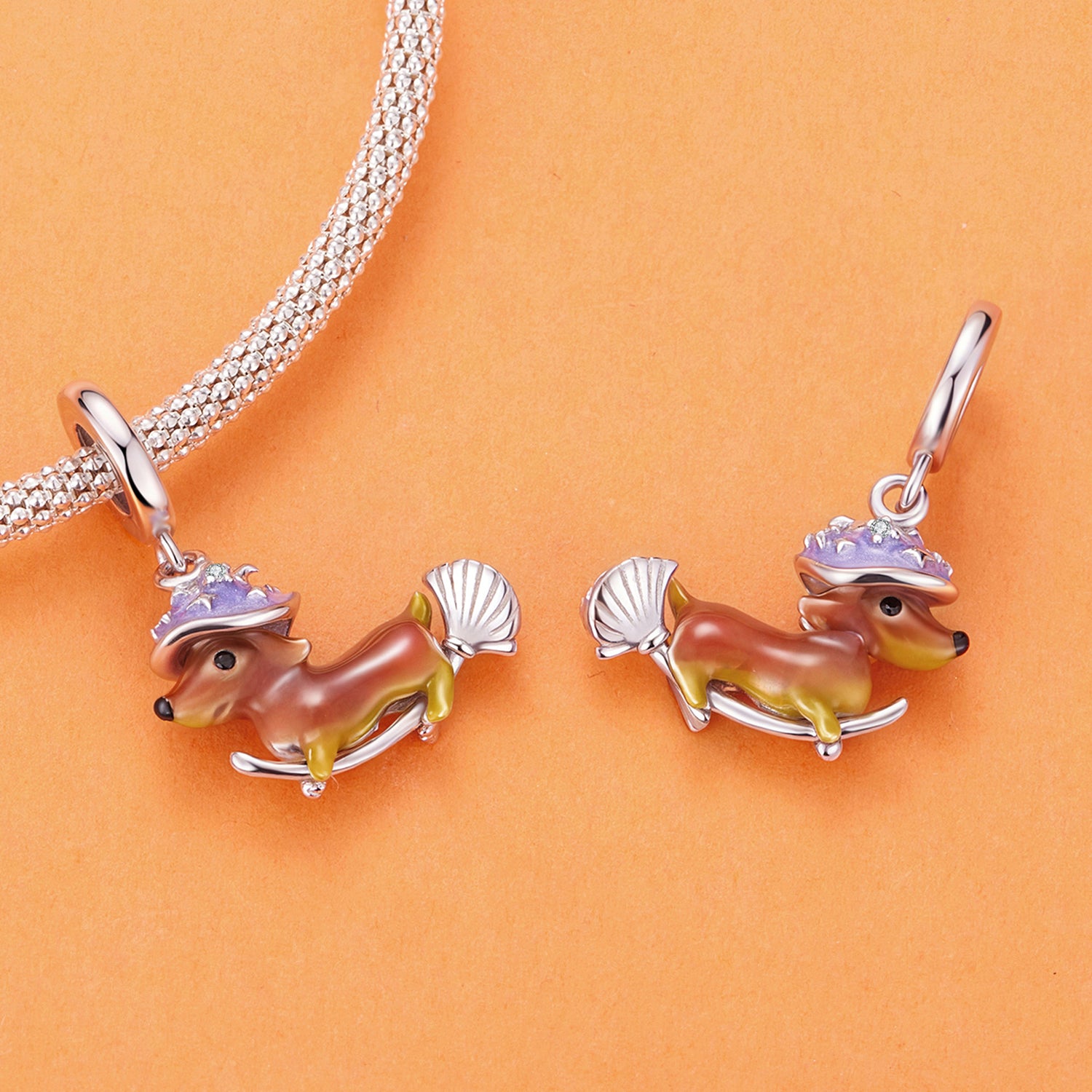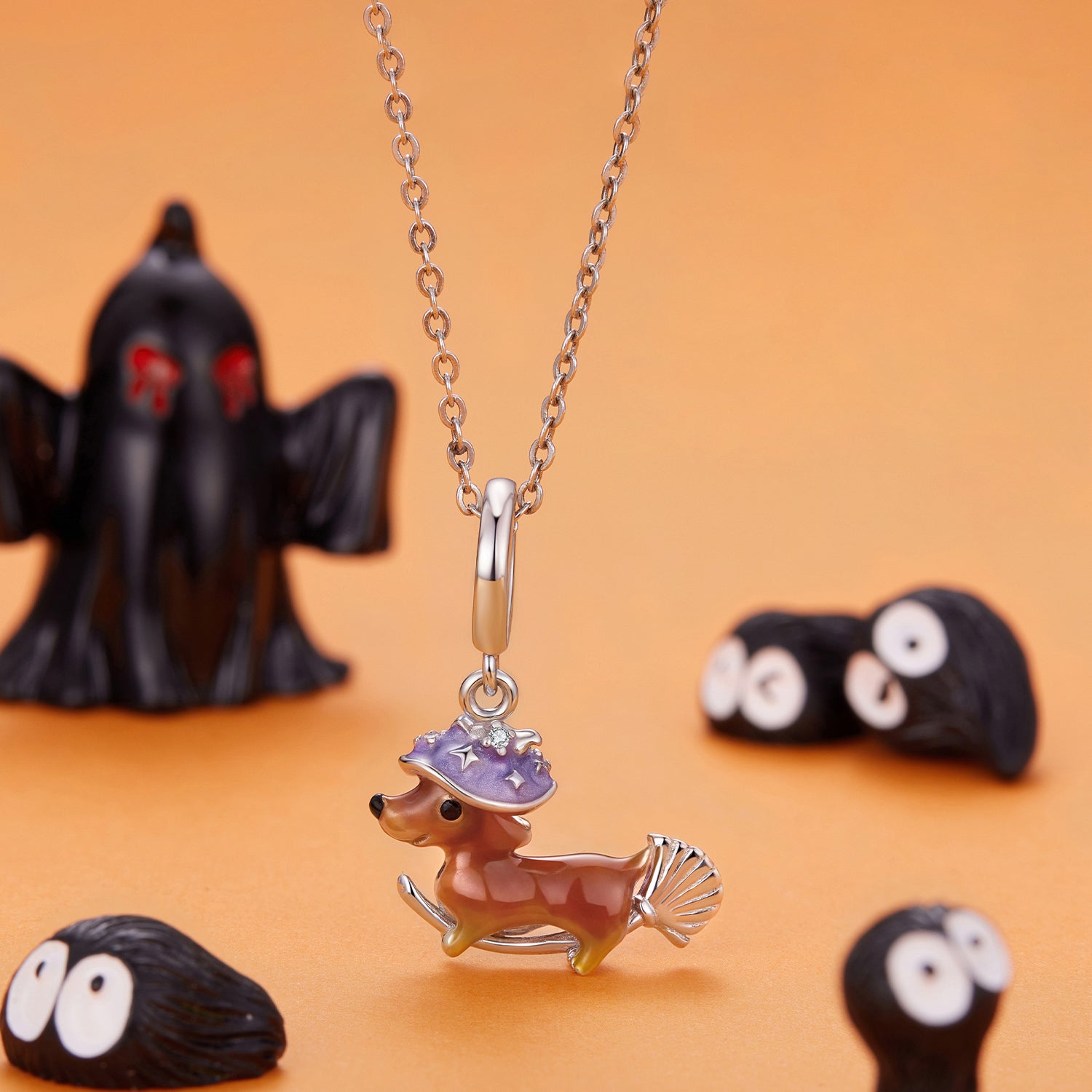 Hravý a očarujúci prívesok v tvare psíka lietajúceho na čarovnej metle. Jeho klobúčik v odtieňoch fialovej s drobnými hviezdami dodáva šperku rozprávkový nádych, zatiaľ čo teplé hnedé tóny psíka vytvárajú milý a veselý dizajn. Ideálny darček pre milovníkov zvierat, fantázie a roztomilých detailov.