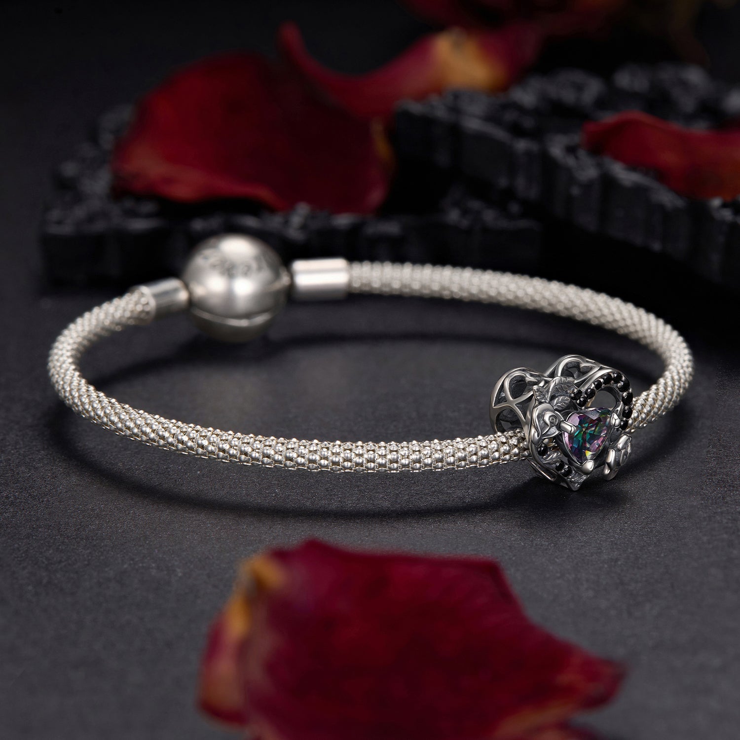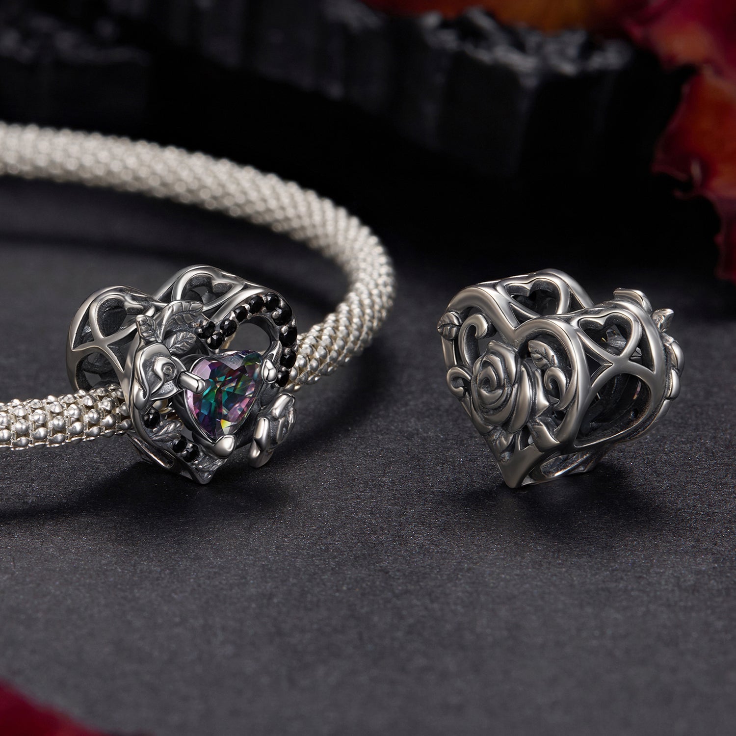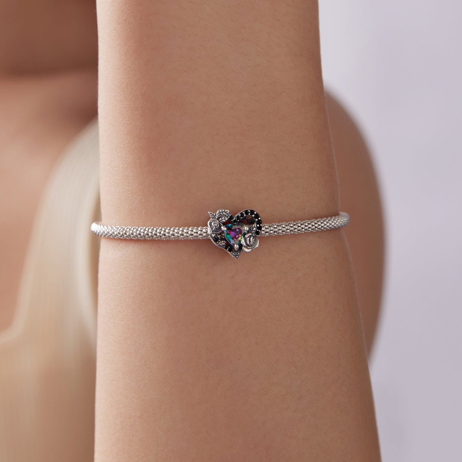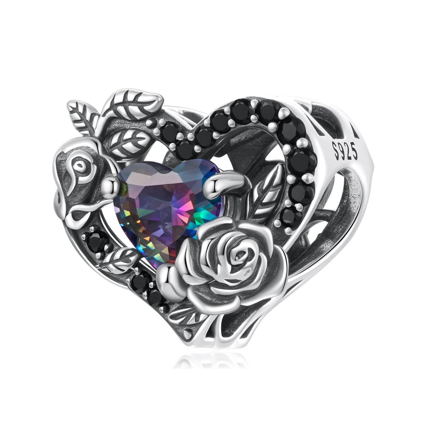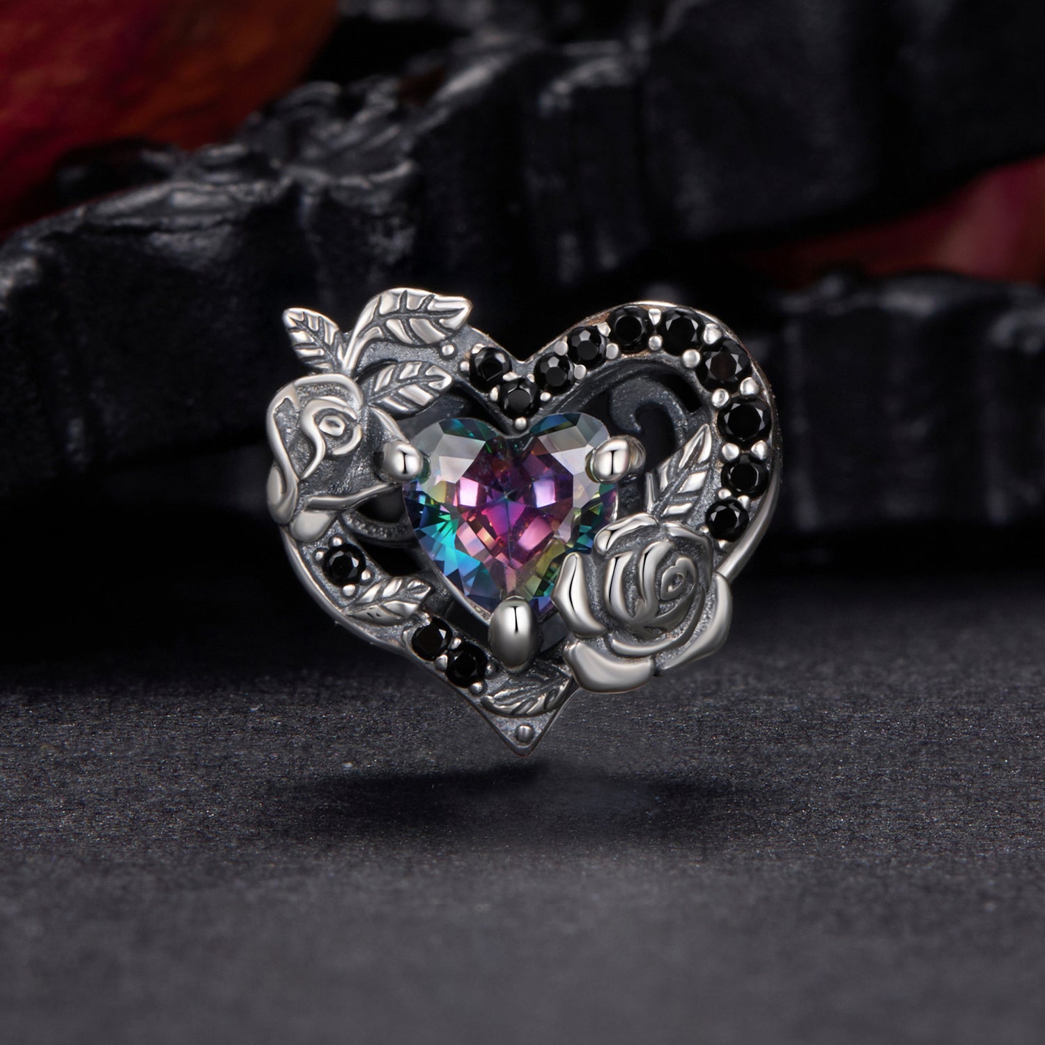 Tento luxusný prívesok v tvare srdca spája eleganciu, jemnosť a výrazný štýl. Dominantou je veľký dúhový krištáľ v tvare srdca, ktorý mení farby pri dopade svetla. Okolo neho sa tiahnu detaily ruží, listov a čiernych kamienkov, čo vytvára dramatický a zároveň romantický dizajn. Ideálny ako darček pre niekoho výnimočného alebo ako šperk s osobným významom.