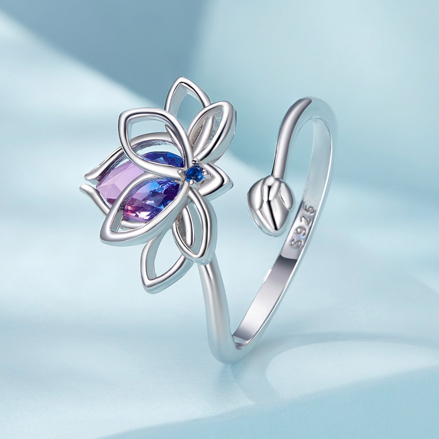 A charming ring in the shape of a blooming lotus, symbolizing purity, growth and harmony. In the heart of the flower, a two-tone crystal in shades of pink and blue shines, giving the jewelry depth and subtle elegance. Made of 925 sterling silver, ideal for everyday wear and special occasions.