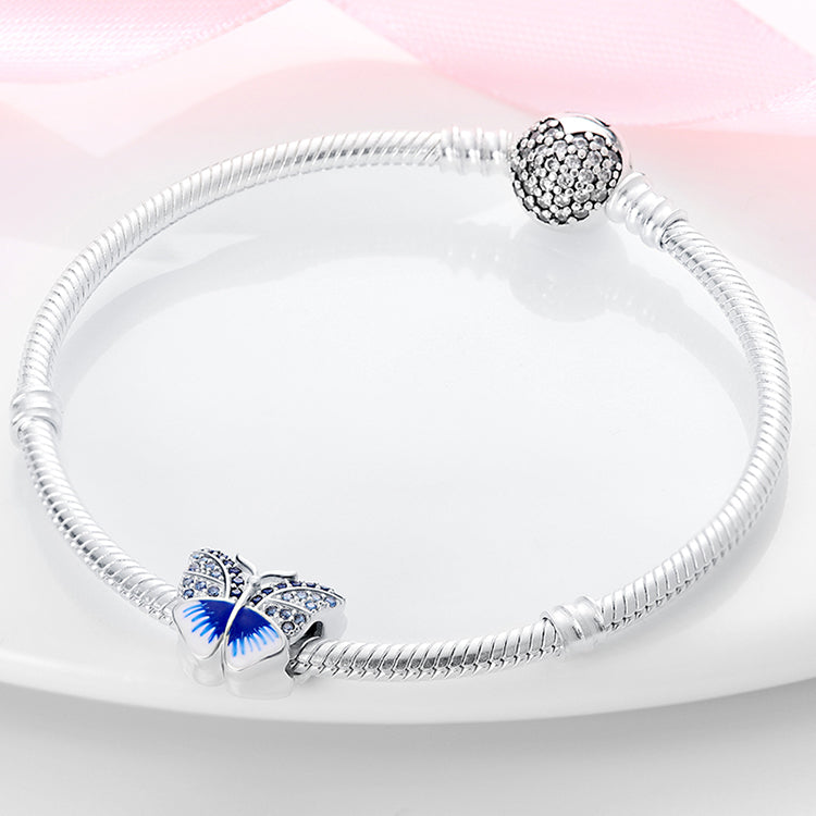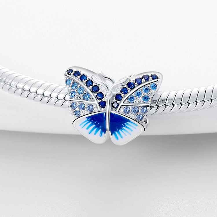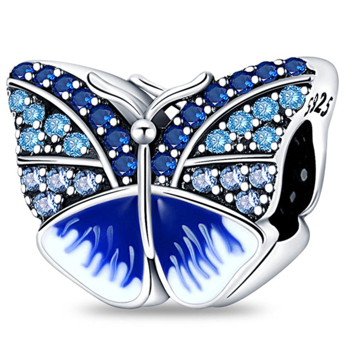 Górna część skrzydełek jest bogato zdobiona połyskującymi, niebieskimi cyrkoniami o różnych odcieniach, a dolna część pokryta jest lśniącym, niebiesko-białym szkliwem, które nadaje biżuterii niepowtarzalny wygląd. Wykonany ze srebra próby 925, koralik ten to idealny dodatek dla miłośników natury i symboliki motyli.