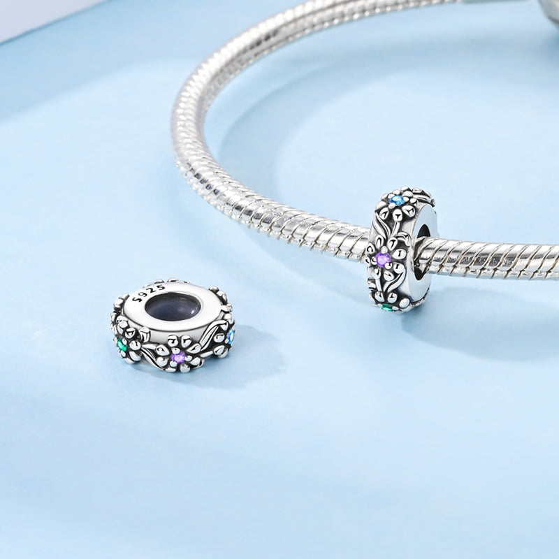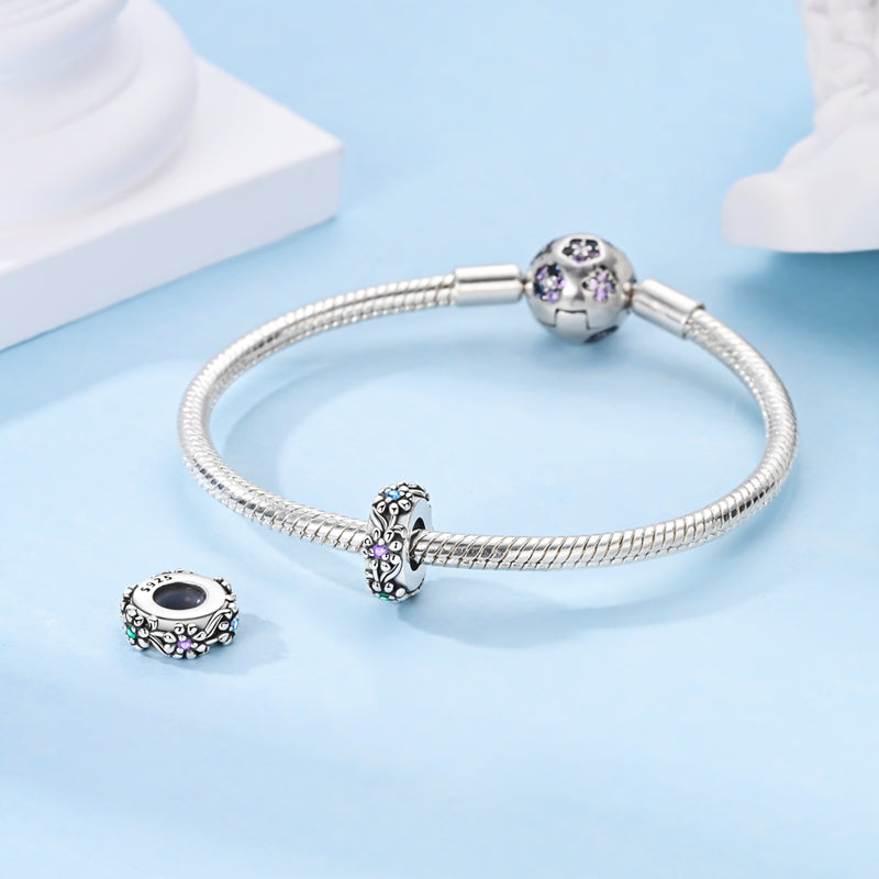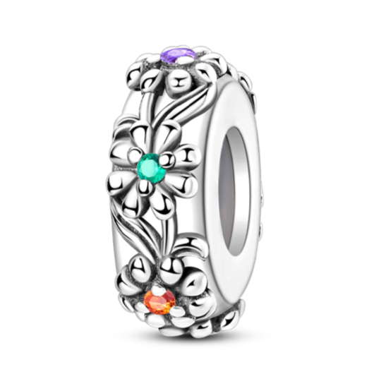 Ten elegancki wisiorek-separator ozdobiony jest delikatnymi kwiatami z kolorowymi cyrkoniami w kolorze fioletowym, zielonym i pomarańczowym. Przypomina kwitnący ogród i nadaje biżuterii świeżości i subtelnego blasku. Stanowi nie tylko piękną ozdobę, ale również praktyczny dodatek do oddzielania i mocowania innych zawieszek na bransoletce.
