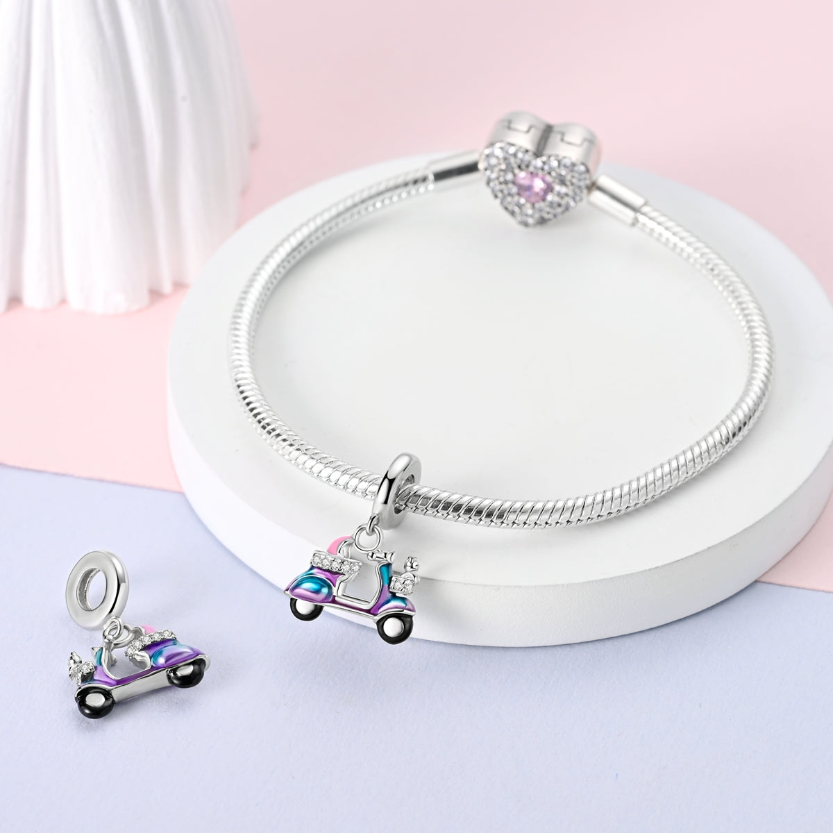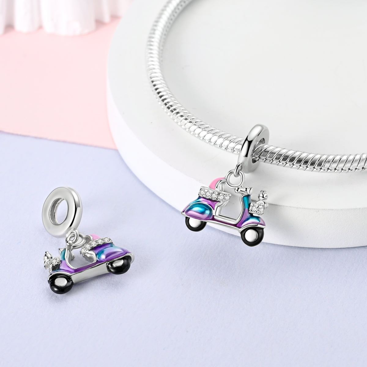 Veselý prívesok v tvare farebného skútra s trblietavými detailmi. Dokonalý symbol slobody, cestovania a letnej nálady.