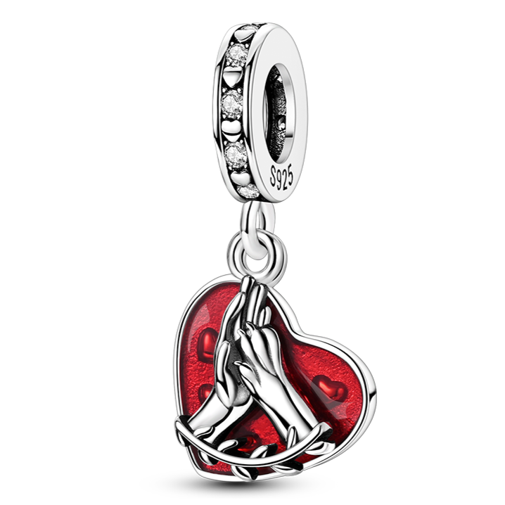 Uderzający, czerwony wisiorek w kształcie serca, na którym dwie dłonie łączą się w geście zrozumienia, modlitwy lub głębokiej wdzięczności. Oplata je gałązka, symbolizująca wzrost i więź. Wisiorek wykonany jest ze srebra próby 925, ozdobiony cyrkoniami i ciemnoczerwoną emalią z maleńkimi serduszkami w tle.