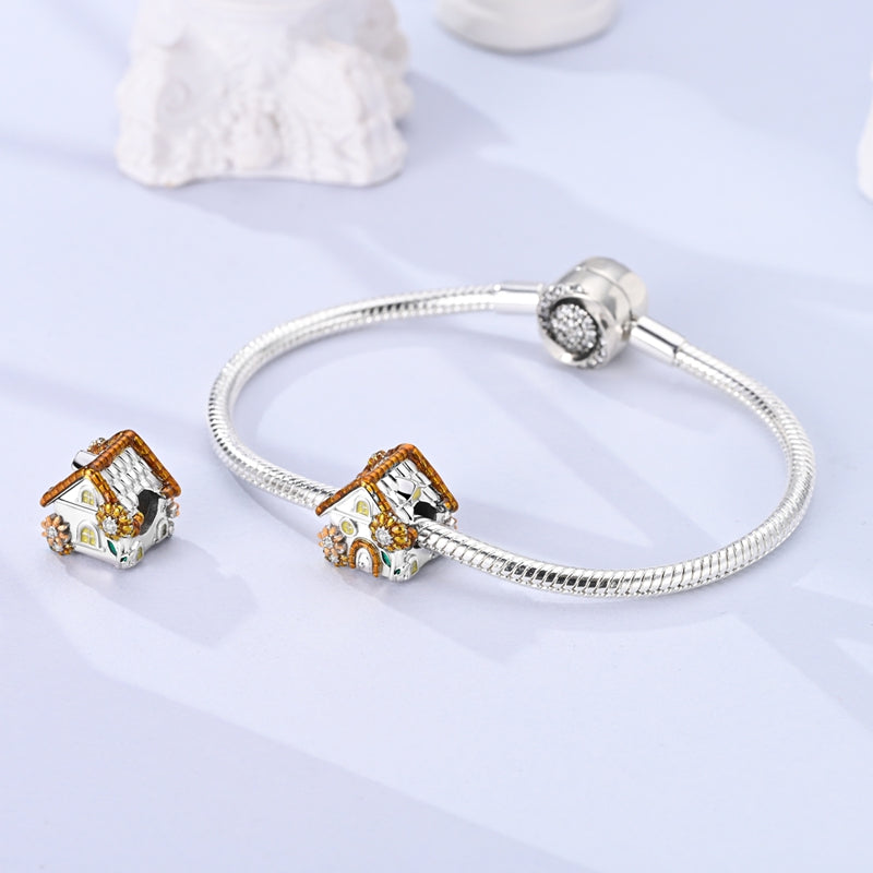 Ten uroczy wisiorek w kształcie domku, ozdobiony słonecznikami i kolorowymi detalami, emanuje ciepłem, spokojem i radością. Połączenie odcieni żółci, pomarańczu i zieleni z cyrkoniami przywodzi na myśl kwiaty łąkowe otaczające wiejski dom. Wykonany ze srebra próby 925, ten element biżuterii jest idealny dla osób ceniących dom, naturę i poczucie bezpieczeństwa.