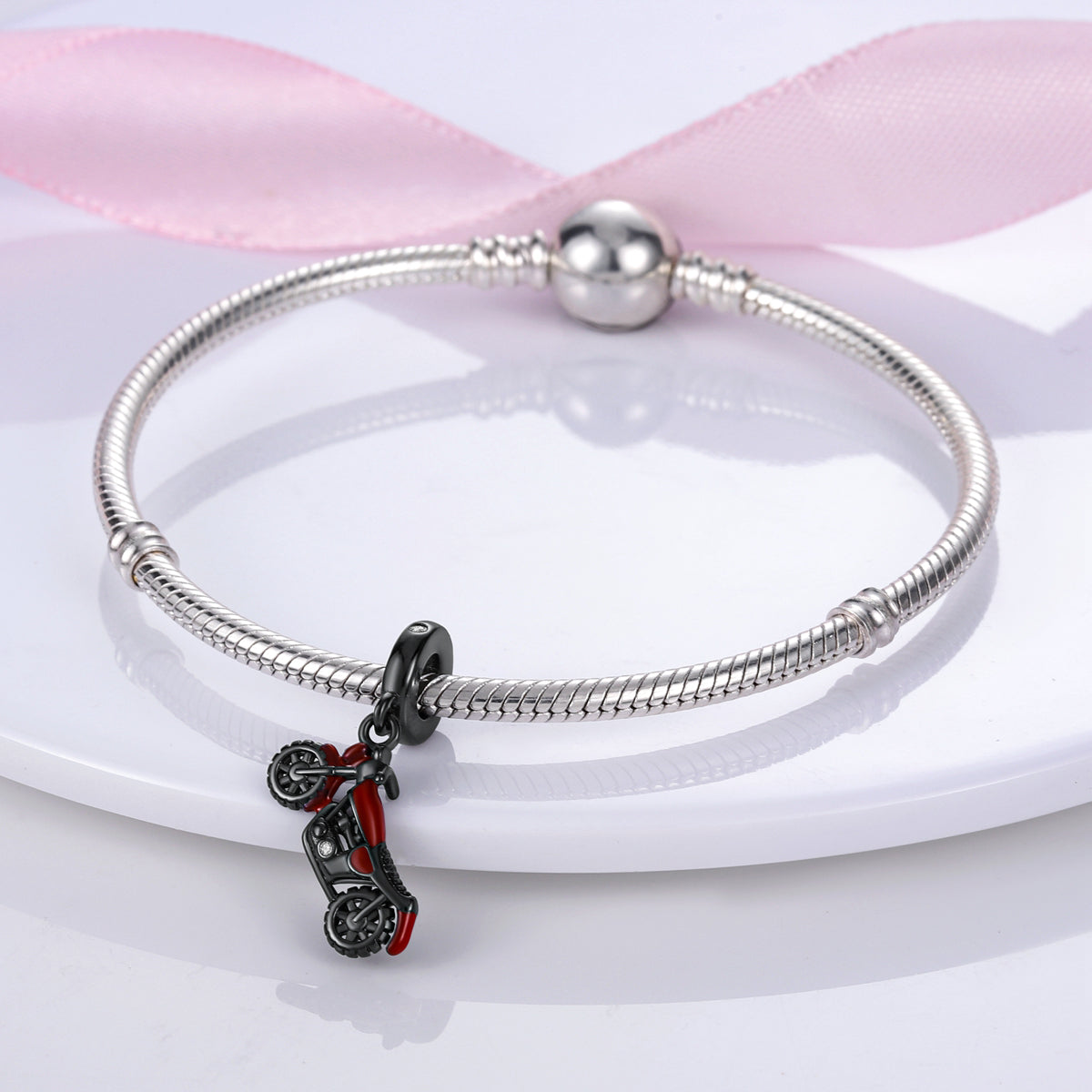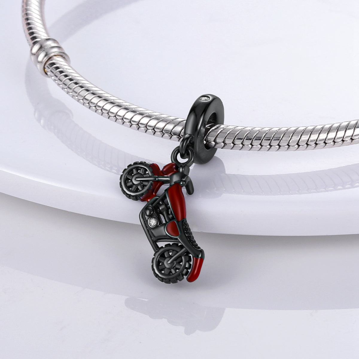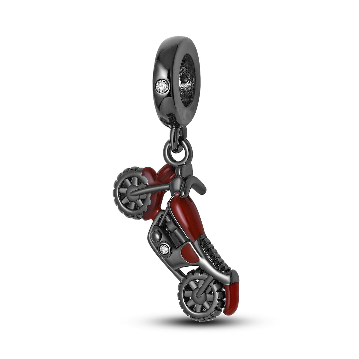 Štýlový prívesok v tvare motorky v tmavom kovovom prevedení s červenými detailmi. Ideálny pre milovníčky rýchlosti, dobrodružstva a výrazných doplnkov.