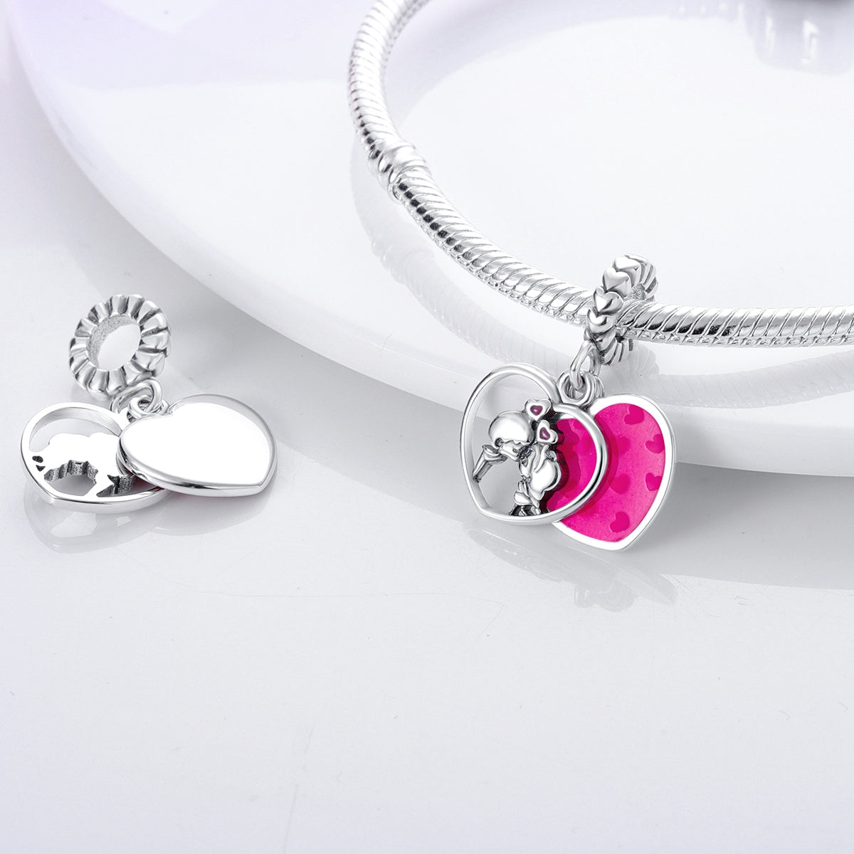 Romantický prívesok s dvojitým srdcom a siluetou zamilovaného páru. Jasné ružové odtiene dodávajú šarm a teplo.