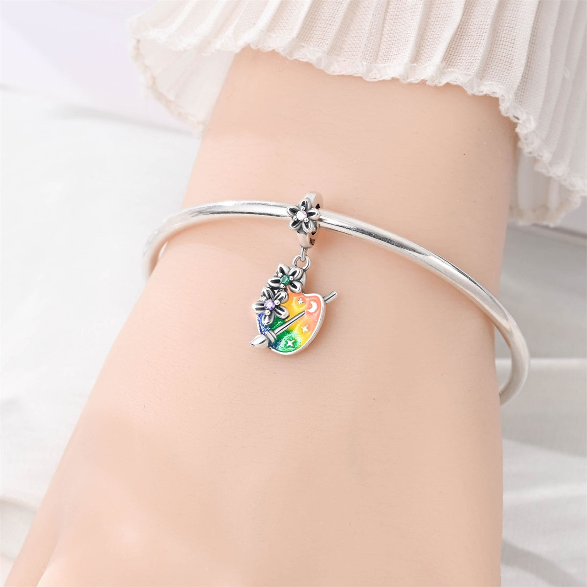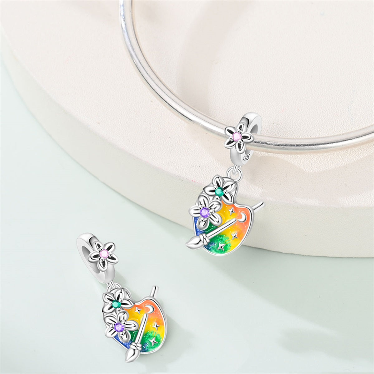 Kreatívny prívesok v tvare maliarskej palety je ideálnym symbolom fantázie, tvorivosti a lásky k umeniu. Farebný smalt s jemným trblietaním pripomína rozmanitosť farieb a nápadov, zatiaľ čo drobné kvety a kamienky dodávajú šperku hravý a originálny vzhľad. Perfektný doplnok pre umelkyne, kreatívne duše alebo každého, kto miluje farby a tvorenie.