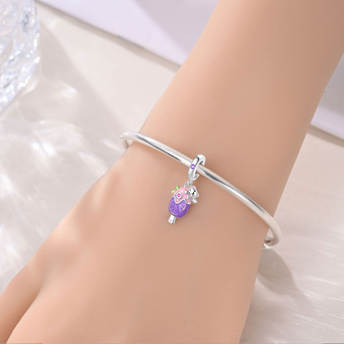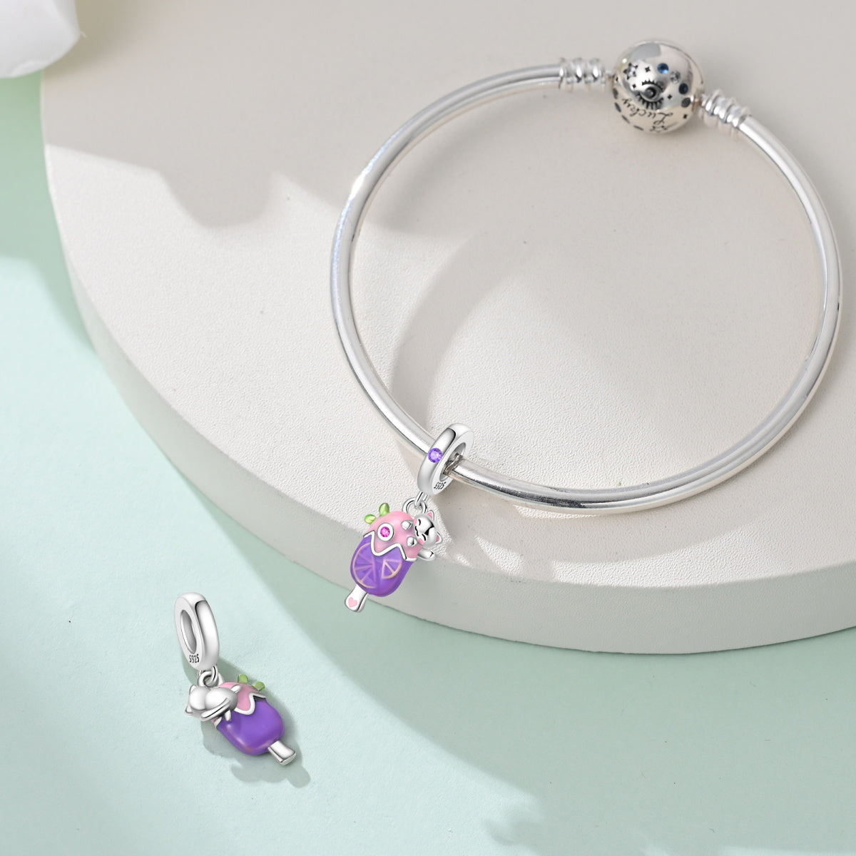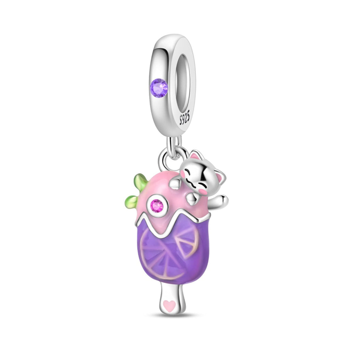 Radosna zawieszka w kształcie kolorowych lodów, ozdobiona uśmiechniętym kotkiem oraz różowo-fioletowymi kryształkami. Ten uroczy wzór wnosi radość, figlarność i letni nastrój na każdy dzień. Idealny na prezent dla miłośników słodyczy, kotów i wyjątkowej biżuterii. Kompatybilna z bransoletkami Pandora.
