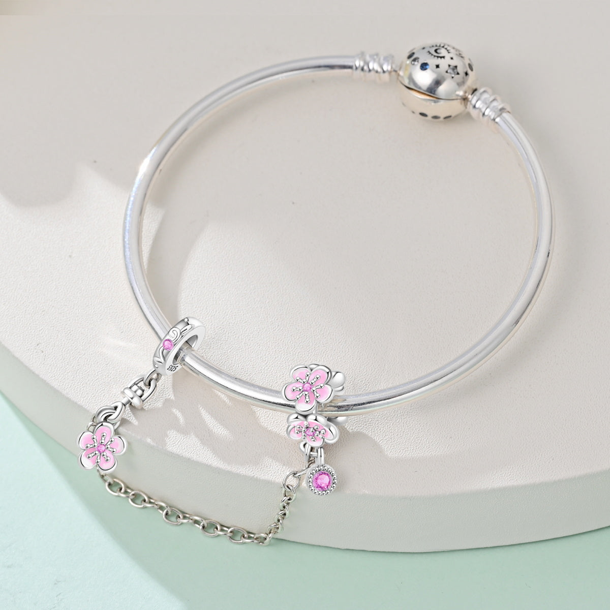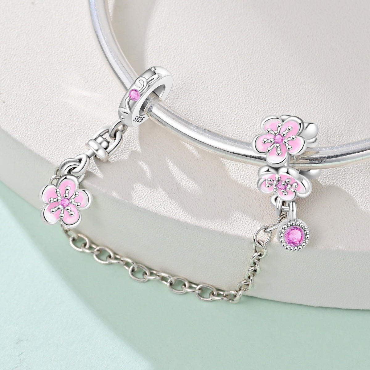 Srebrny łańcuszek zabezpieczający z delikatnymi różowymi kwiatkami zabezpieczy Twoją bransoletkę przed zgubieniem. Elegancki i kobiecy design łączy w sobie praktyczność z pięknem. Różowe kwiaty i kryształowe detale nadają bransoletce romantycznego charakteru. Kompatybilna z bransoletkami Pandora.