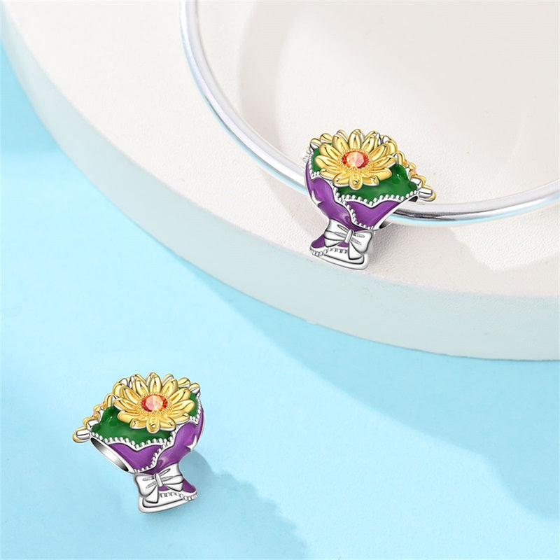 Promienna srebrna zawieszka „Słonecznik” wnosi energię i optymizm na każdy dzień. Złoty kwiat z centralną częścią ozdobioną pomarańczową cyrkonią symbolizuje radość, ciepło i nowy początek. Barwne detale z fioletowej i zielonej emalii przywodzą na myśl piękno bukietu przewiązanego kokardą, czyniąc z biżuterii radosny talizman pełen życia.