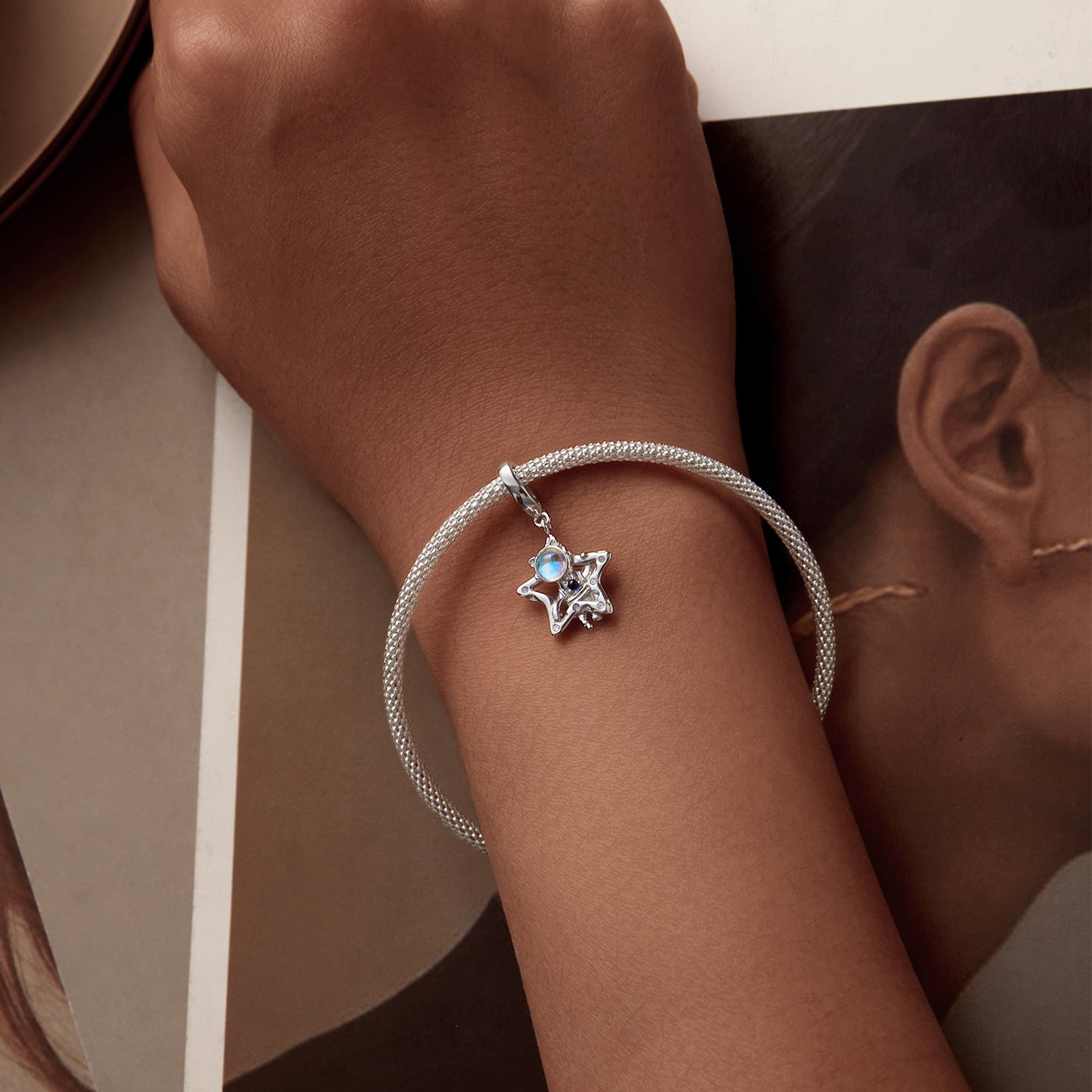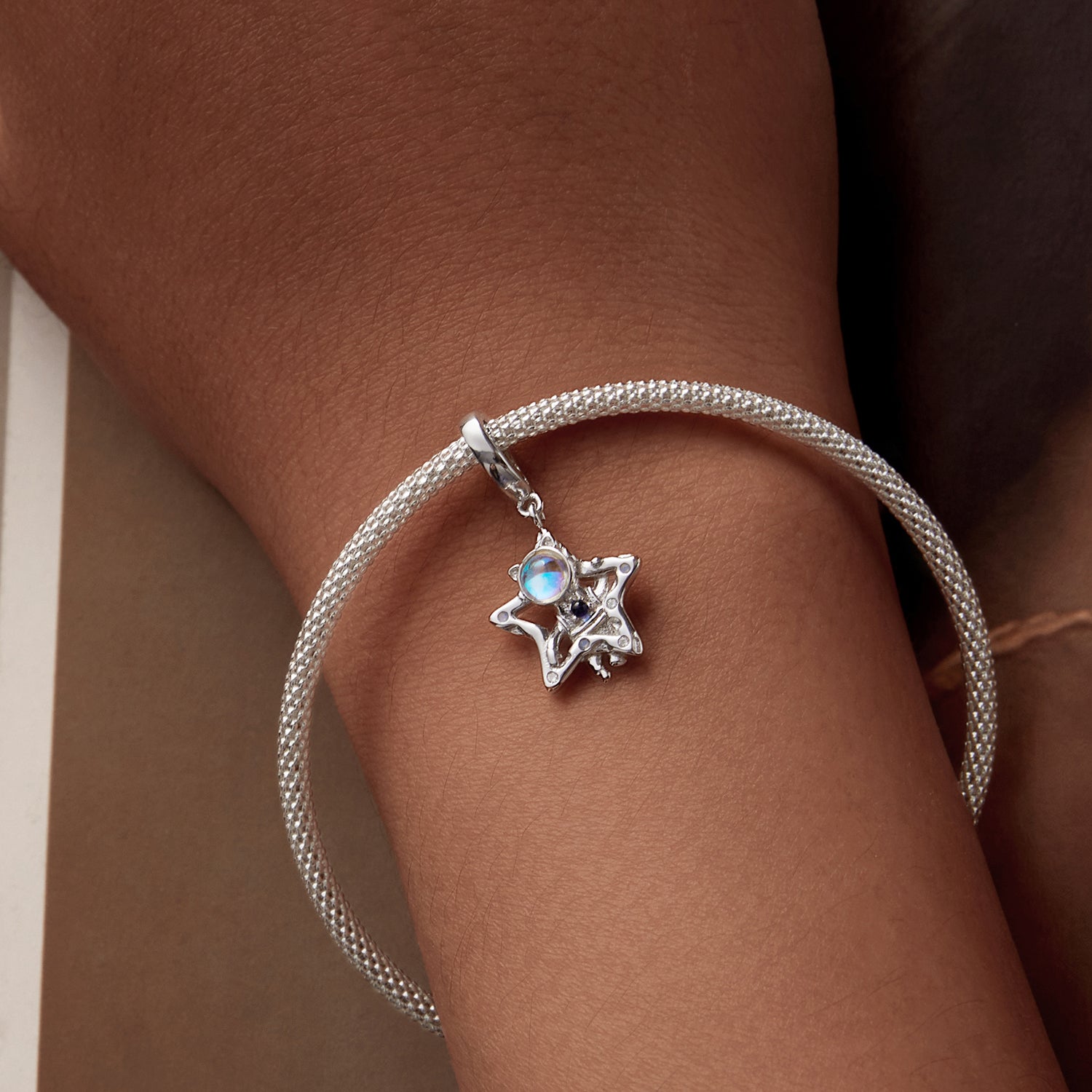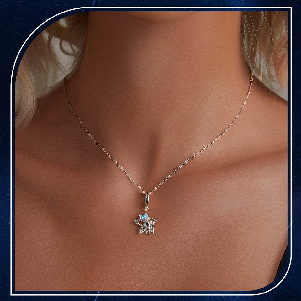 Oryginalny srebrny wisiorek w kształcie gwiazdy, w którym ukryty jest uroczy kotek z tęczowym kamieniem zamiast głowy. Wokół niego lśnią delikatne kamienie w odcieniach błękitu i opalu. Ta biżuteria symbolizuje fantazję, figlarność i nieskończony wszechświat marzeń.
