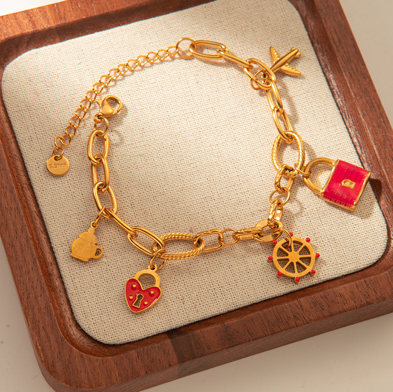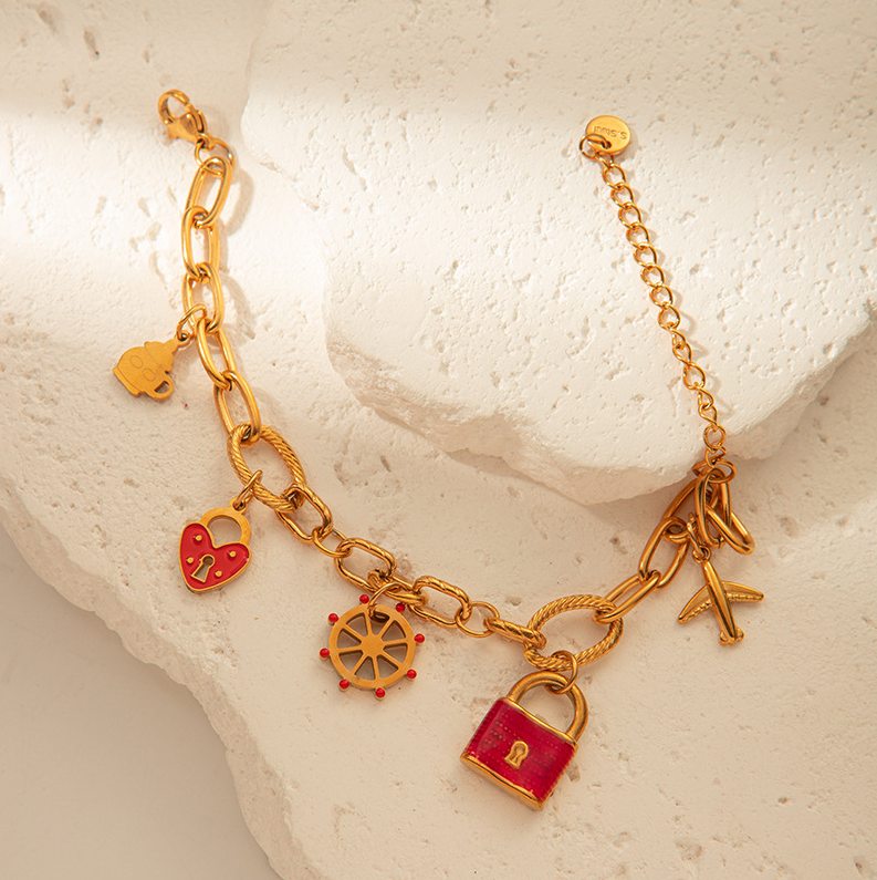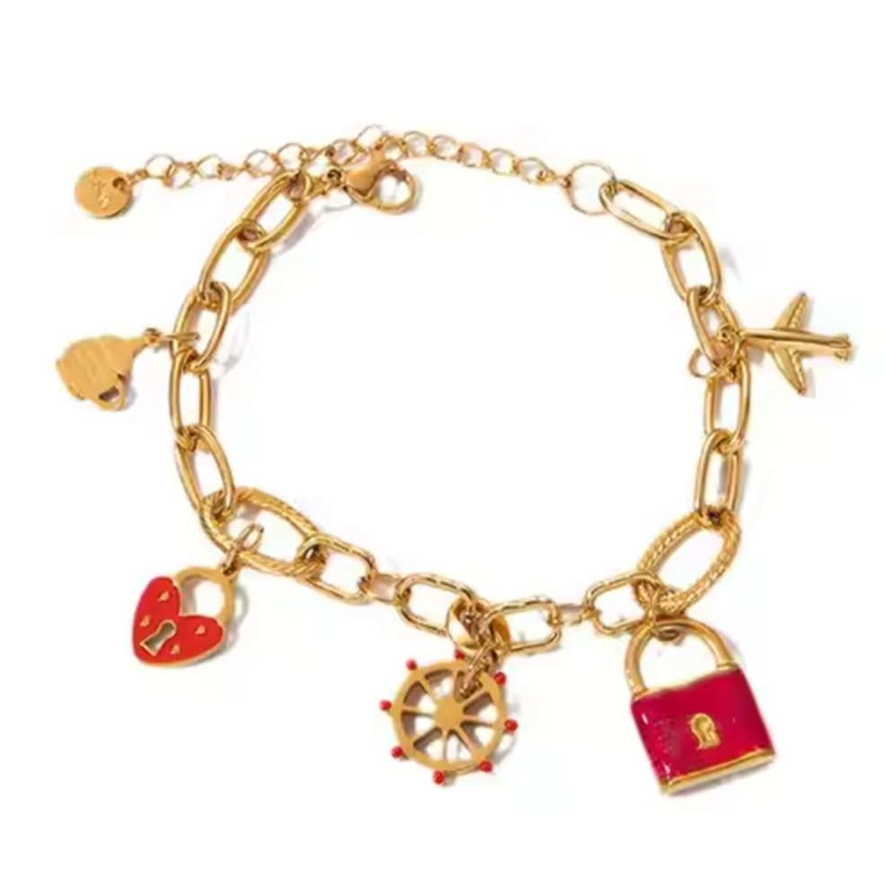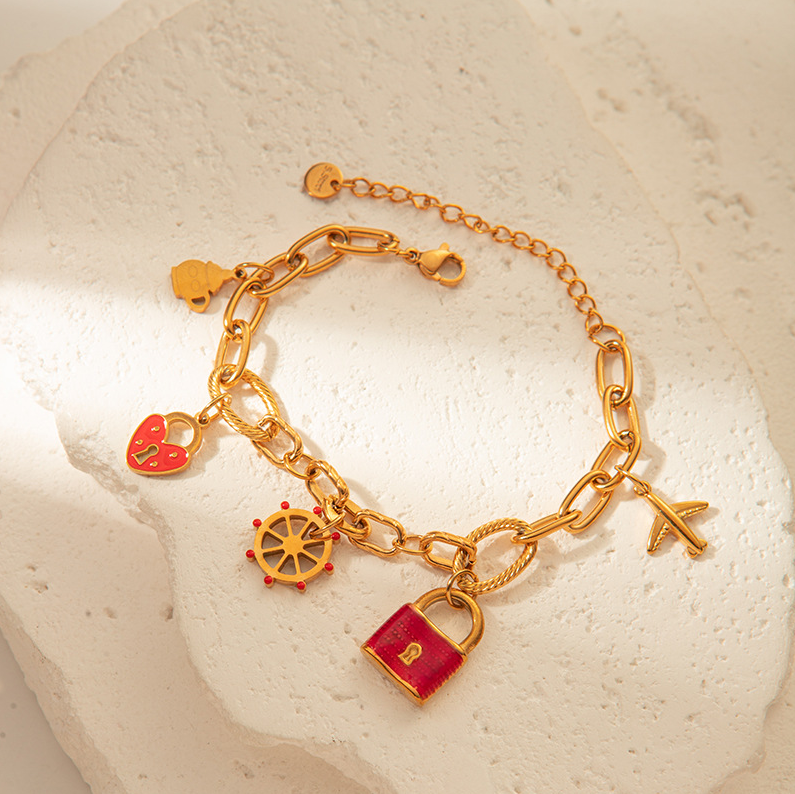 💎 Náramok 'Cesta snov' – štýlový doplnok pre snílkov a milovníkov objavovania. Zdobený príveskami v tvare lietadielka, lodného kormidla, srdiečka a zámku, symbolizuje slobodu, lásku k cestovaniu a túžbu po nových obzoroch. Ideálny darček pre tých, ktorí radi objavujú svet a uchovávajú si spomienky na výnimočné chvíle.
