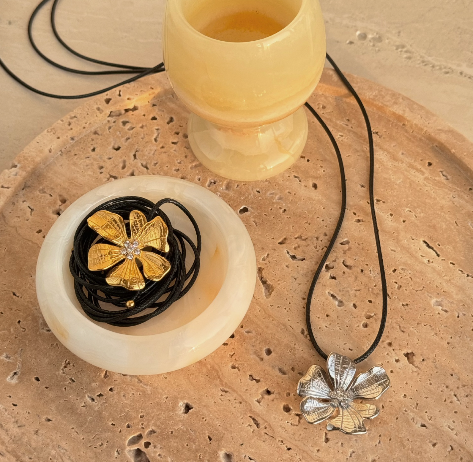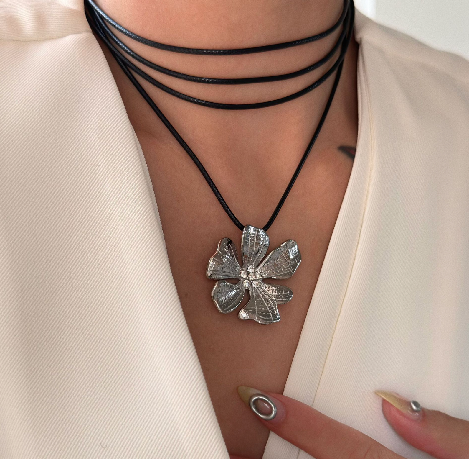 Táto elegantná podvieska v tvare kvetu, vyrobená v striebornom odtieni, je jemným a štýlovým doplnkom. Kvetinový dizajn v kombinácii s čiernou šnúrkou vytvára moderný kontrast, ktorý je ideálny pre každodenné nosenie. "Kvet v tieni" prináša sofistikovaný, no jednoduchý štýl, ktorý oživí každý outfit.