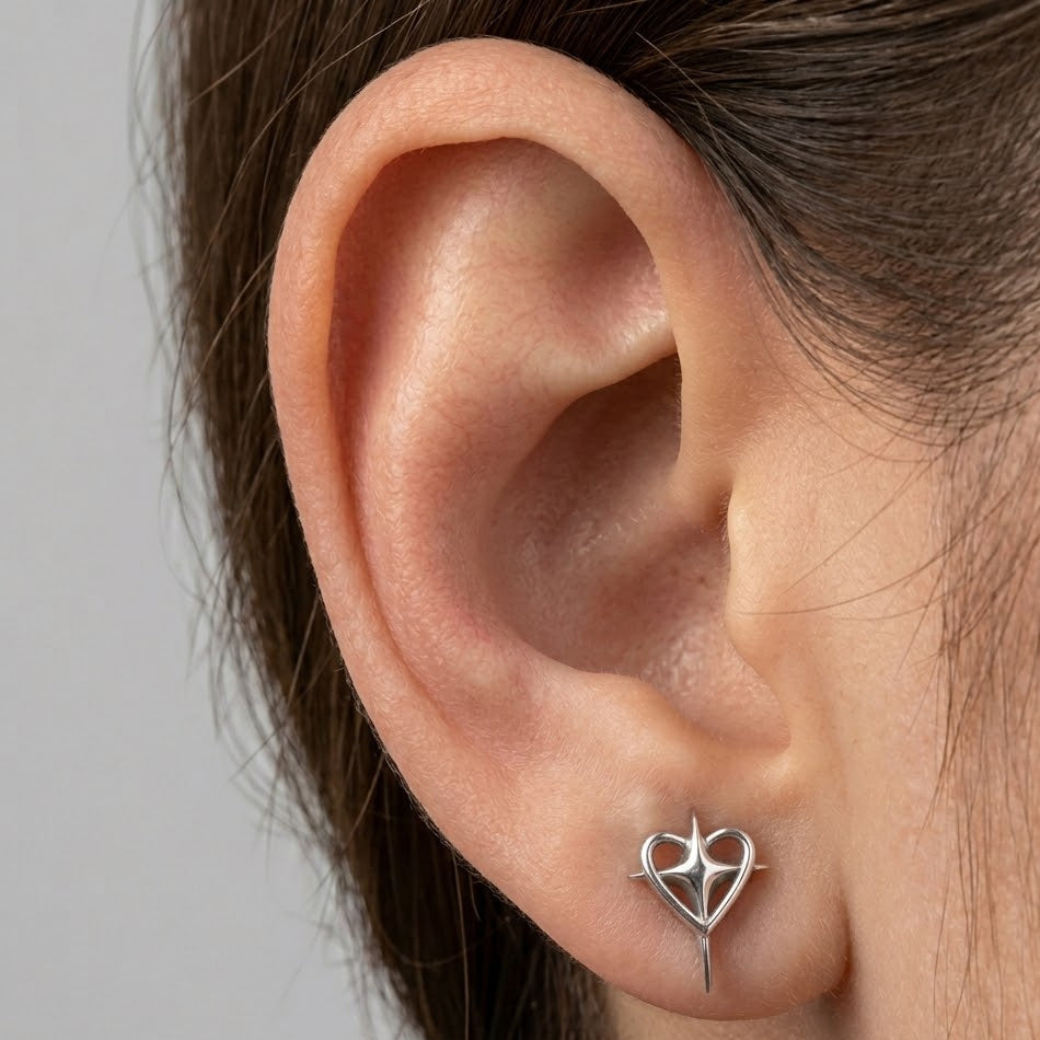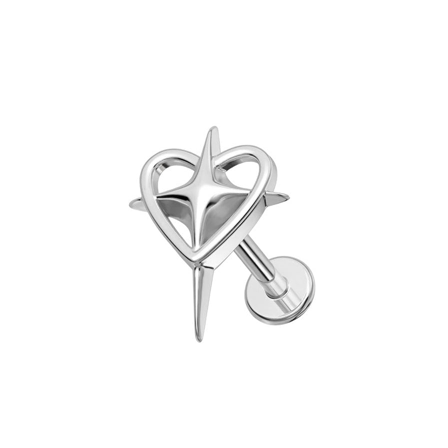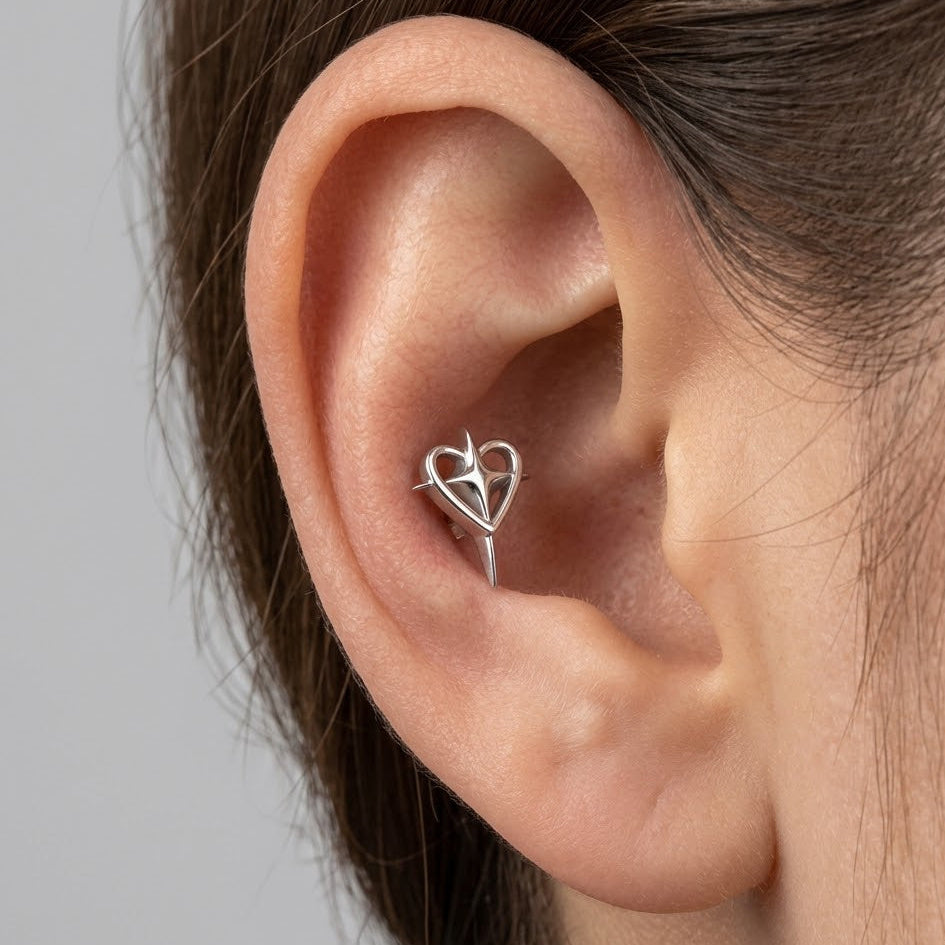 Tento podmanivý piercing predstavuje dokonalú harmóniu romantiky a moderného, ostrého dizajnu. Ústredným prvkom je jemné, hladké srdce, cez ktoré prechádza dynamická a ostrá štvorcípa hviezda (pôsobiaca ako meč alebo tŕň). Tento šperk je vyrobený z prvotriedneho implantátového titánu G23, čo zaručuje, že je mimoriadne ľahký, odolný a predovšetkým bezpečný pre vašu pokožku (hypoalergénny). Celokovový, vysoko leštený strieborný povrch podčiarkuje jeho sofistikovaný a mierne rebelantský charakter, vďaka čomu je ideálnym doplnkom pre tých, ktorí chcú vyjadriť svoju jedinečnosť.