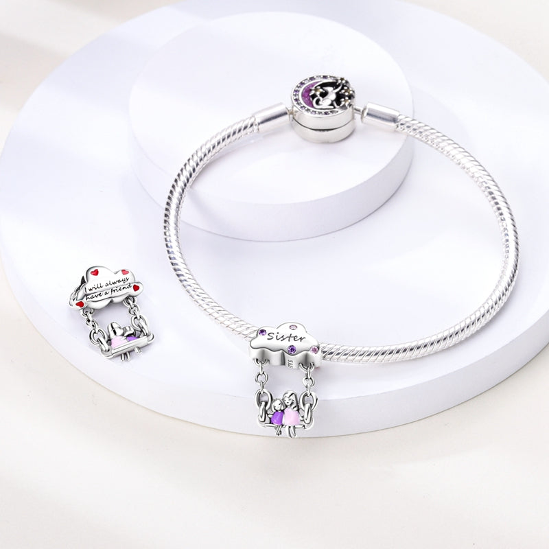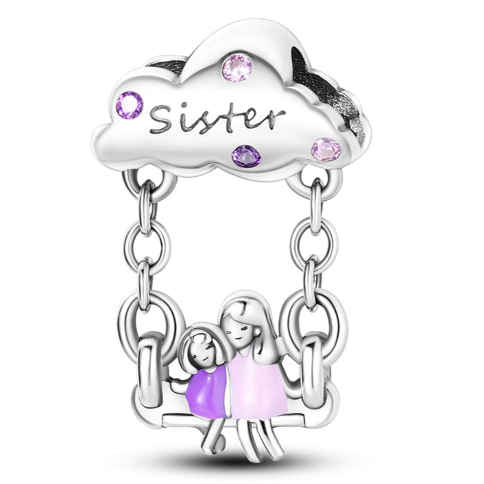 Táto nežná korálka Sestry navždy dokonale zachytáva výnimočné puto medzi sestrami. Symbolizuje lásku, radosť a vzájomnú podporu, ktorú si súrodenci poskytujú po celý život. Hlavným motívom je obláčik so slovom "Sister", zdobený jemnými fialovými kryštálmi, z ktorého visí hojdačka s dvoma objímajúcimi sa sestrami.