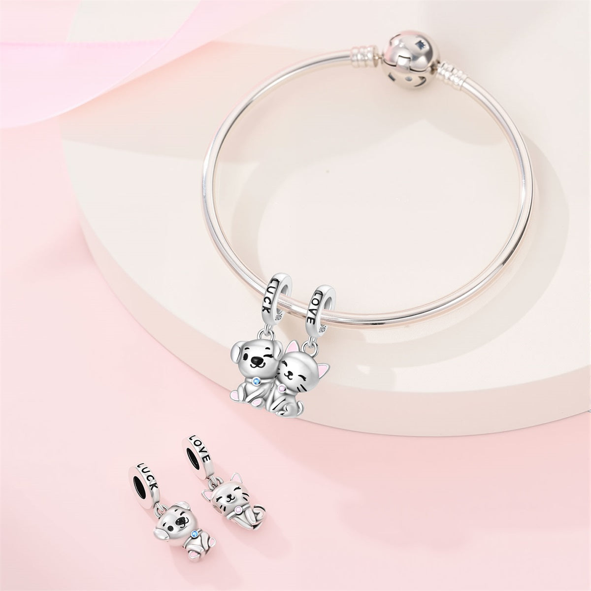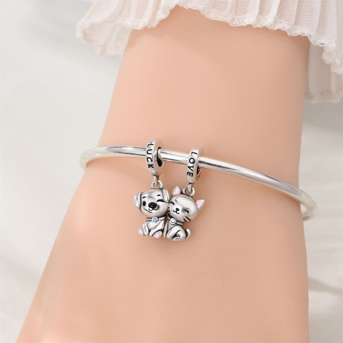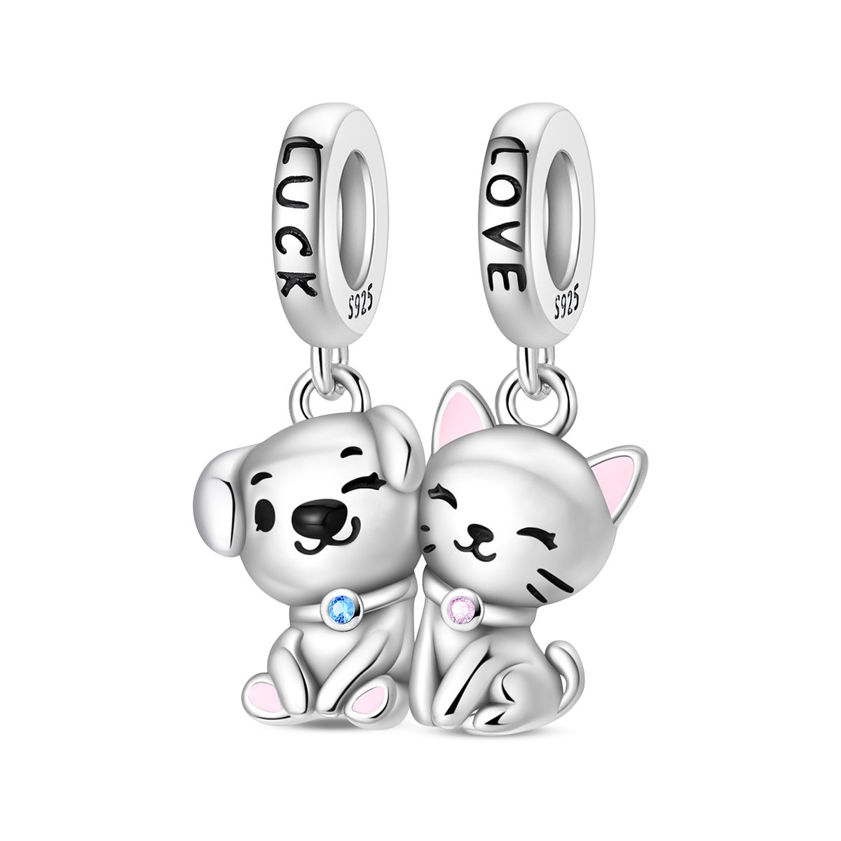 Roztomilý dvojitý prívesok s usmiatym psíkom a mačičkou symbolizuje priateľstvo, vernosť a lásku medzi blízkymi dušami. Jemné farebné detaily a trblietavé kamienky dodávajú šperku hravý a nežný vzhľad. Ideálny doplnok pre milovníčky zvierat aj ako milý darček plný pozitívnych emócií.