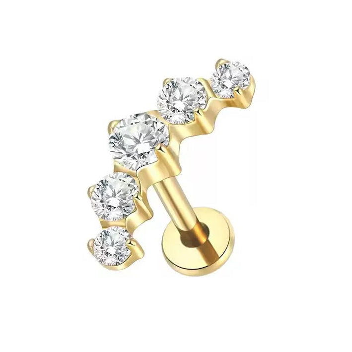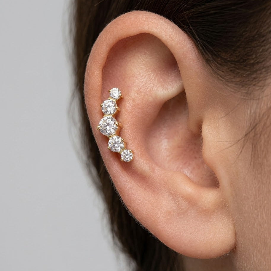 Ez a piercing a tisztaság, a luxus és a maximális kényelem megtestesítője. A legmagasabb minőségű, öt csillogó cirkónia kő finom, elegáns ívbe rendezve tökéletesen követi a fül vagy az ajak anatómiáját. Ez a kialakítás ragyogó vízesés hatását kelti, amely minden mozdulattal elkapja a fényt. Az implantátum minőségű titán (G23/ASTM F136 tanúsítvánnyal) használatának köszönhetően ez az ékszer nemcsak vizuálisan lenyűgöző, hanem hipoallergén, könnyű és rendkívül tartós is. Ideális választás azok számára, akik biztonságos, tartós és rendkívül esztétikus darabot keresnek mindennapi stílusukhoz.