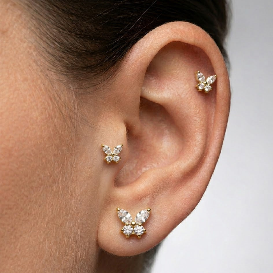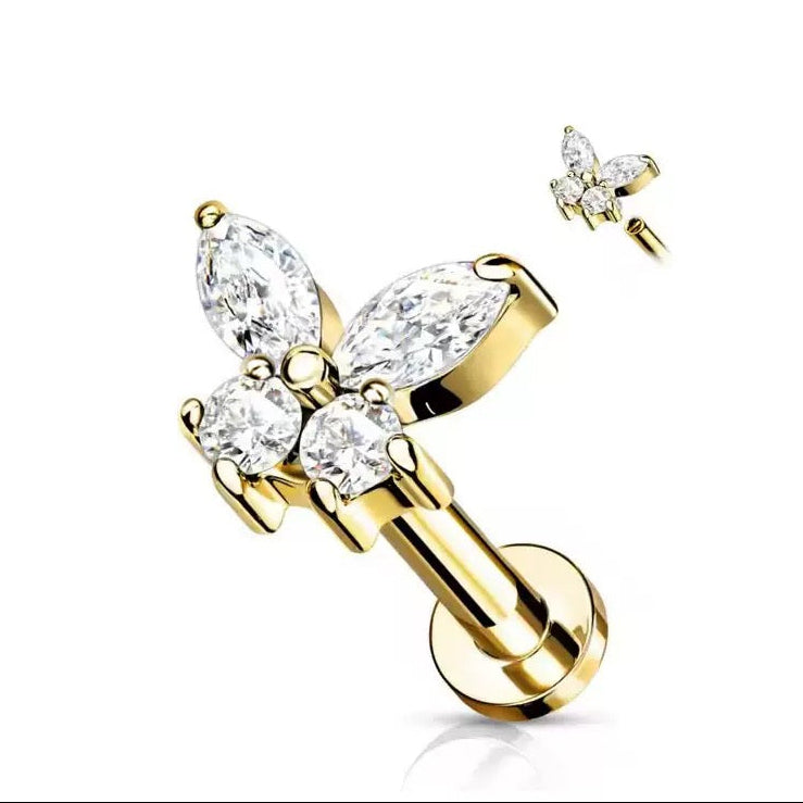 Tento luxusný piercing v tvare jemného motýľa spája špičkovú kvalitu materiálu s oslnivým dizajnom. Motýlik je zdobený precízne vybrúsenými čírymi zirkónmi v tvare marquise a okrúhlych kamienkov, ktoré dokonale zachytávajú svetlo a dodávajú šperku neprehliadnuteľný jas. Vďaka použitiu implantátového titánu (G23) je piercing nielen krásny, ale aj mimoriadne ľahký a šetrný k pokožke. Zlaté prevedenie pôsobí sofistikovane a moderne, čo z neho robí ideálny doplnok pre každodenné nosenie aj špeciálne príležitosti.