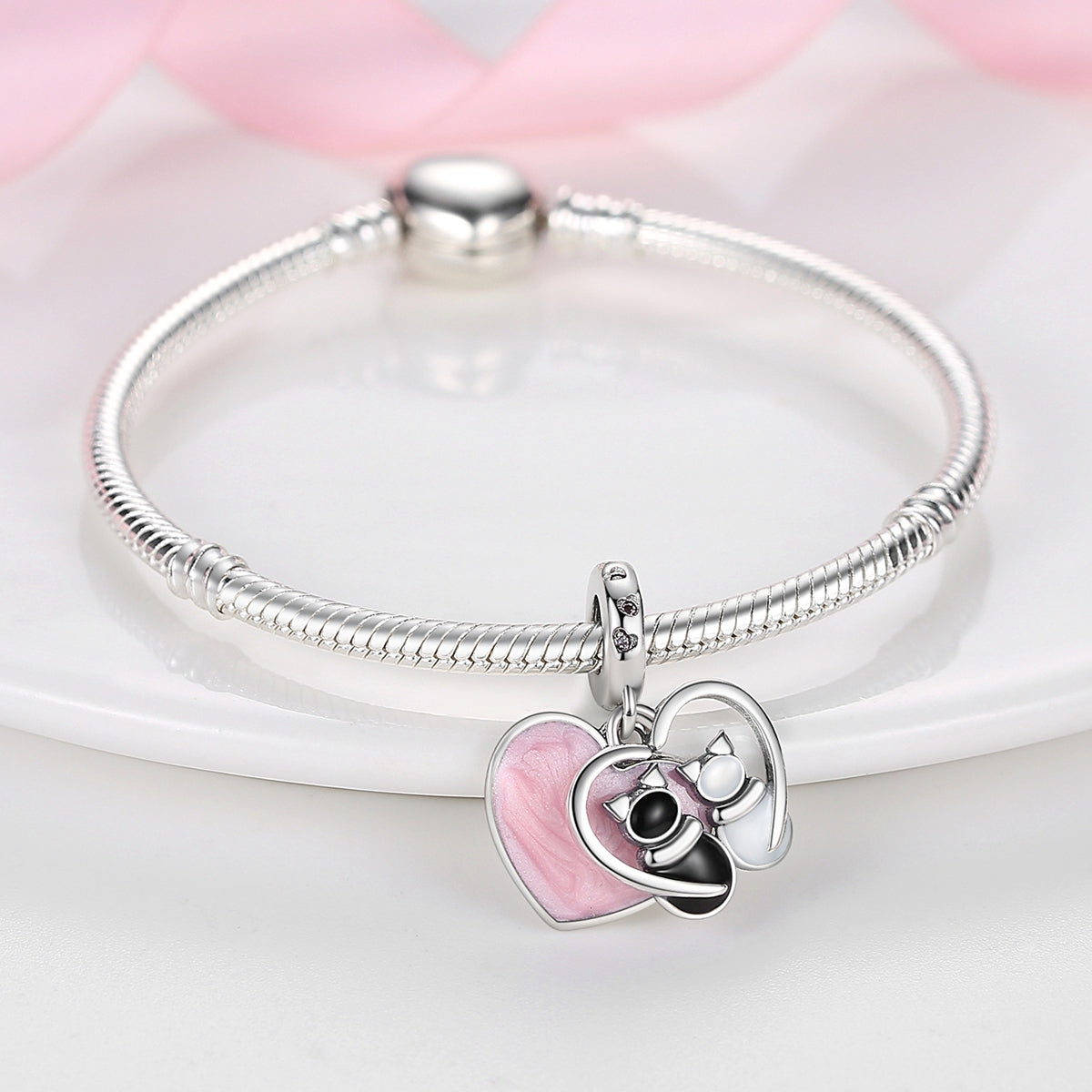 Nádherný prívesok s dvoma mačičkami v tvare srdca, ktoré spolu vytvárajú symbol lásky a harmónie. Jemný ružový smalt a kontrast čiernej a striebornej mačky dodávajú prívesku romantický a elegantný vzhľad.