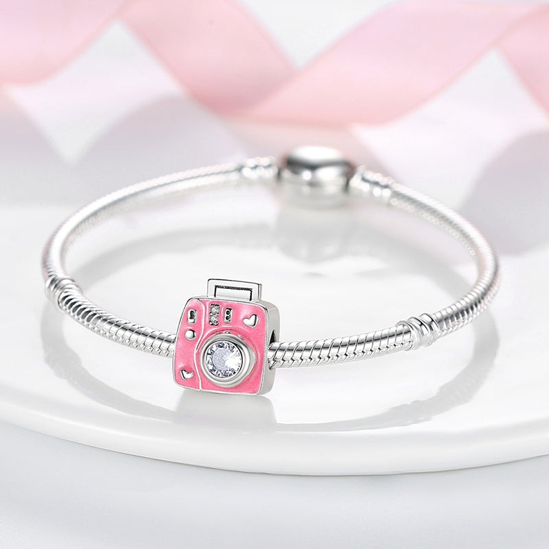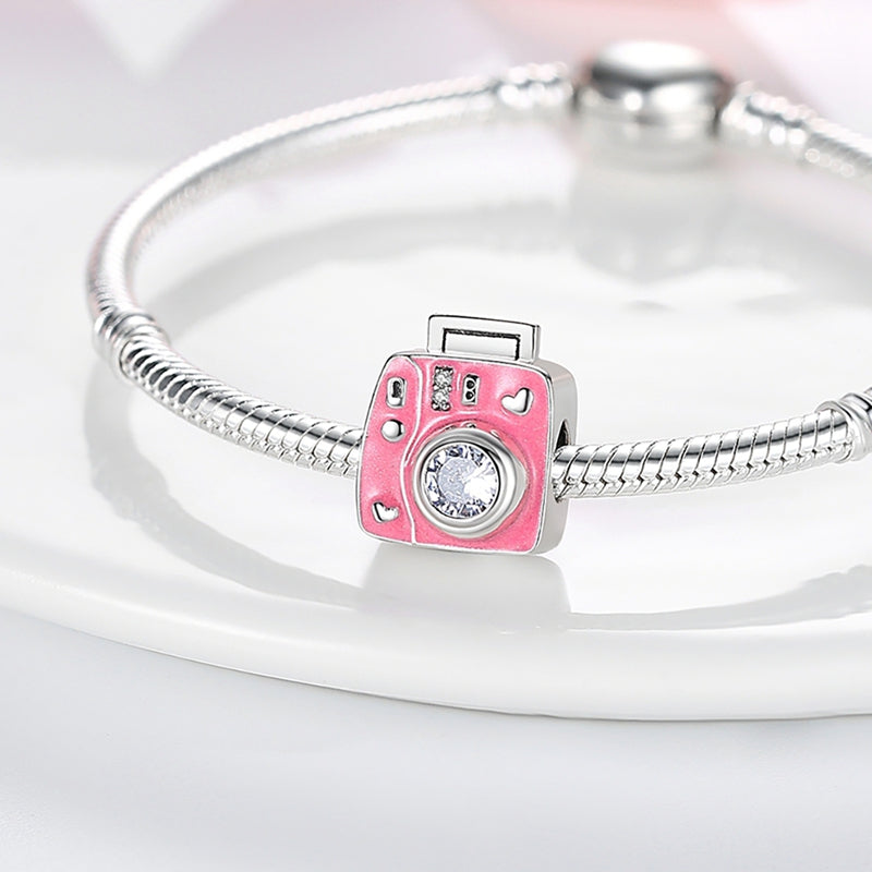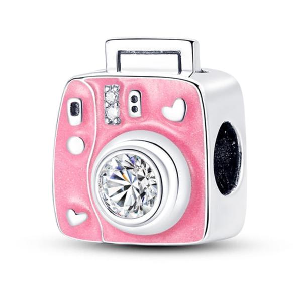 Táto rozkošná korálka v tvare fotoaparátu s ružovým smaltom a jemnými detailami vyjadruje vášeň pre zachytávanie krásnych momentov života. Predná časť je ozdobená kryštálom, ktorý symbolizuje objektív, pričom drobné srdiečka dodávajú romantický vzhľad.
