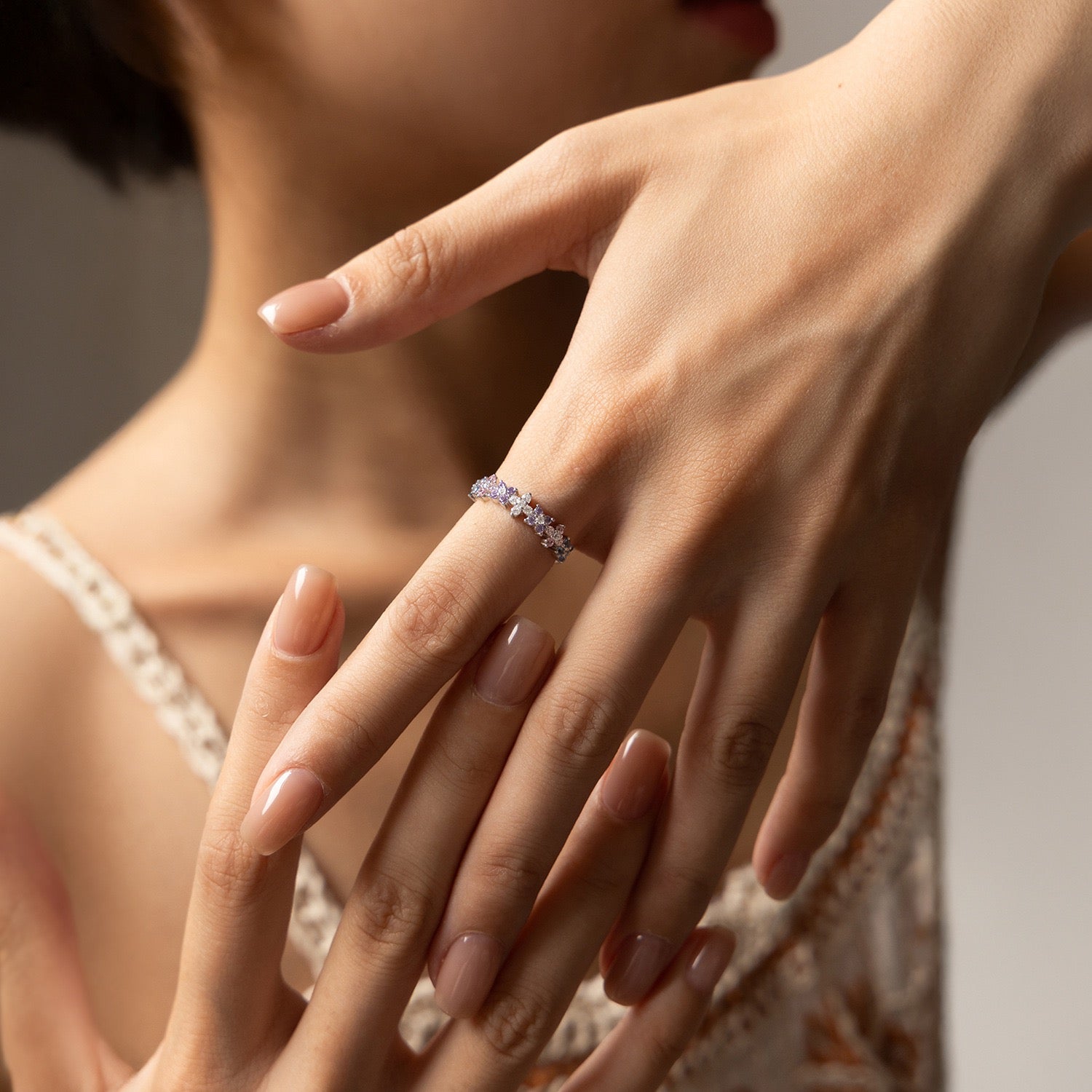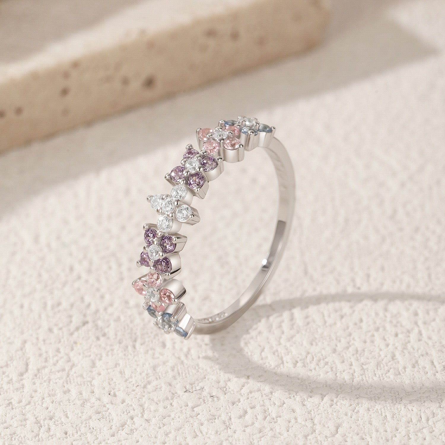 Jemný strieborný prsteň zdobený drobnými farebnými kamienkami v tvare malých kvietkov pôsobí romanticky a hravo. Kombinácia pastelových odtieňov a lesklých detailov vytvára elegantný šperk, ktorý krásne doplní každodenný aj slávnostný outfit. Prsteň je vyrobený zo striebra, vďaka čomu ponúka príjemné nosenie, odolnosť a nadčasový vzhľad.