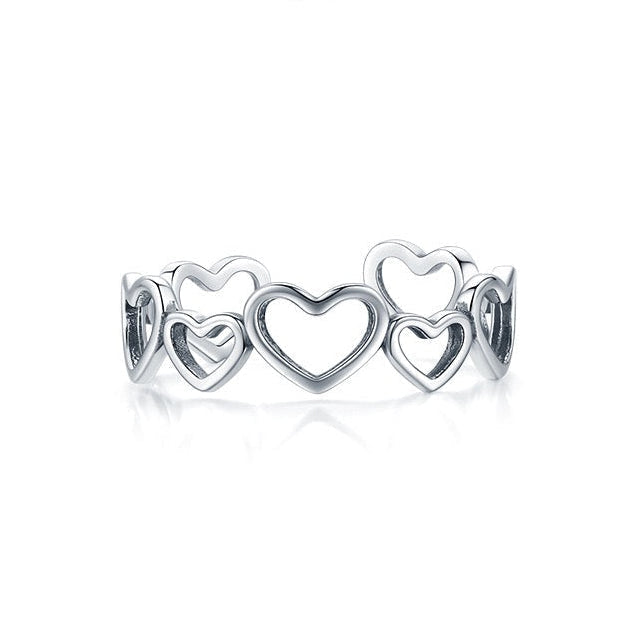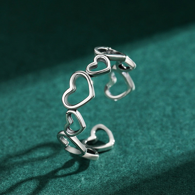 Jemný prsteň zdobený prepojenými srdiečkami pôsobí romanticky a zároveň moderne. Otvorený dizajn dodáva šperku ľahkosť a eleganciu, vďaka čomu sa hodí na každodenné nosenie aj ako milý darček z lásky. Minimalistické spracovanie umožňuje jednoduché kombinovanie s ďalšími prsteňmi či šperkami. Vyrobený je zo striebra, ktoré zabezpečuje kvalitu, trvácnosť a pohodlné nosenie.