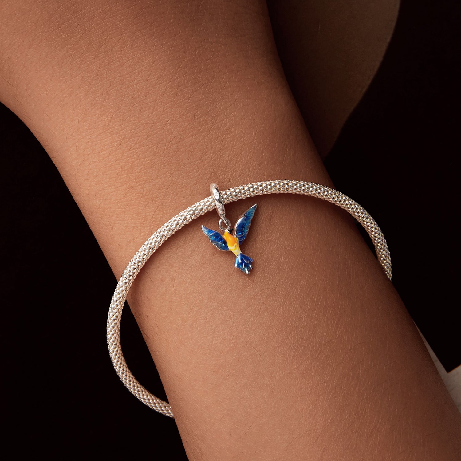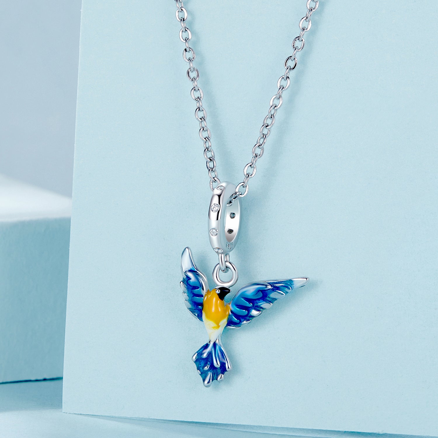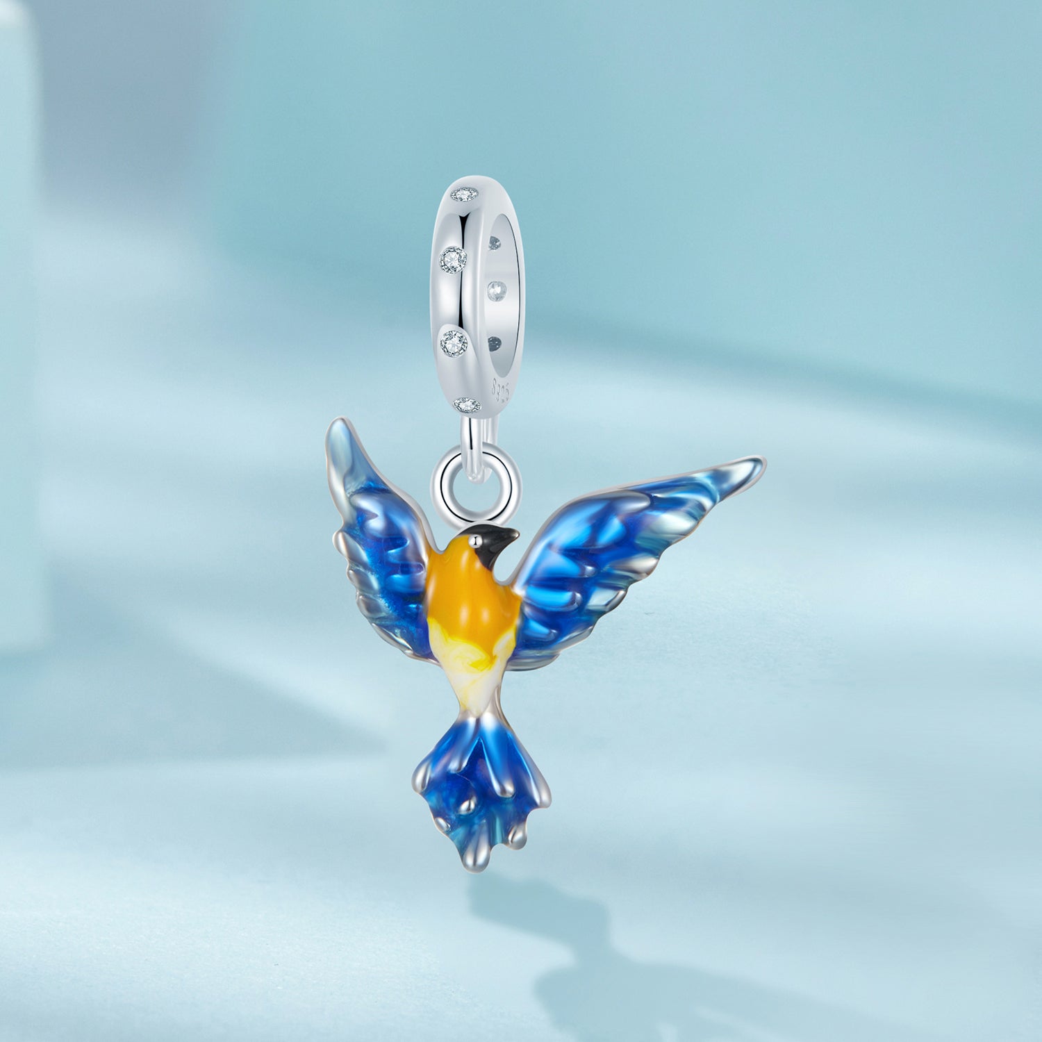 Nápaditý přívěsek ve tvaru ptáka s roztaženými křídly symbolizuje svobodu, lehkost a radost ze života. Ozdobený barevnou glazurou v modro-žlutých tónech a jemnými krystalky na uchycení. Vhodný pro náramky typu Pandora.