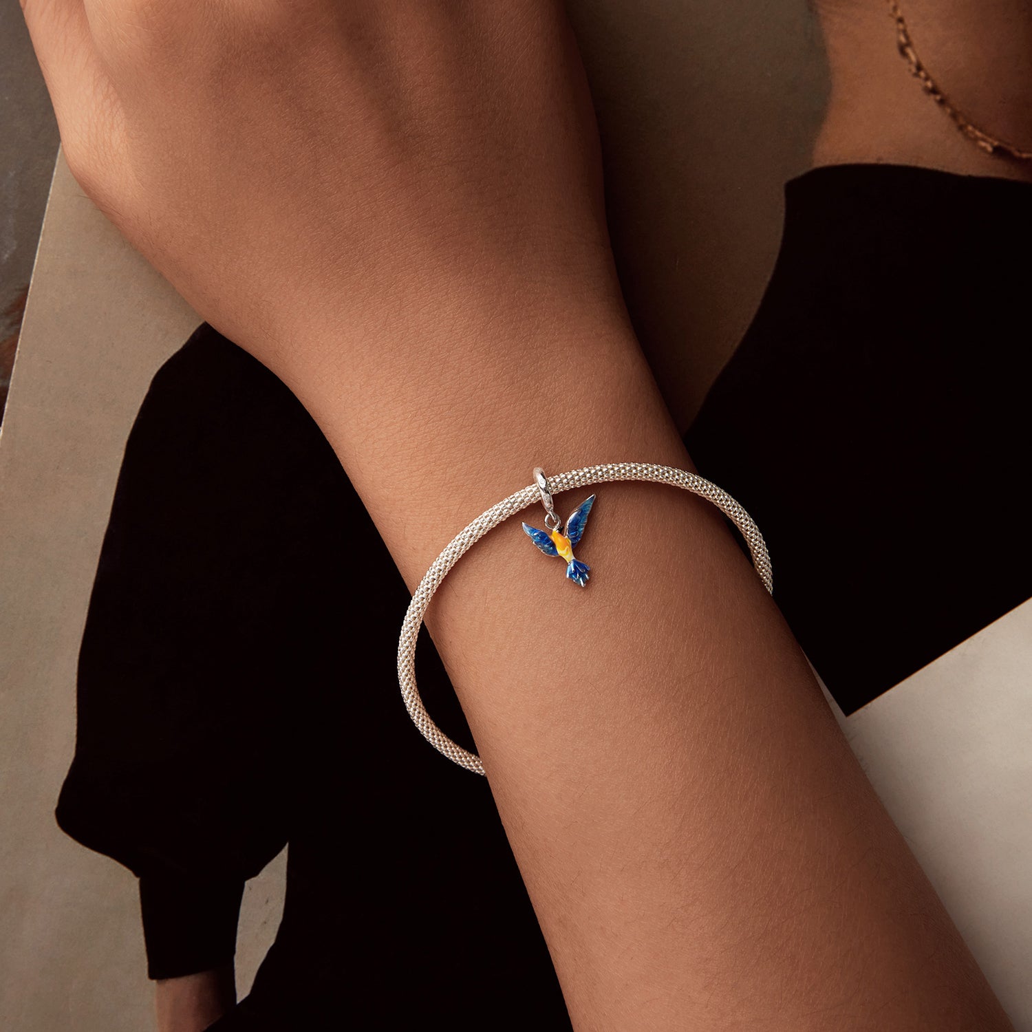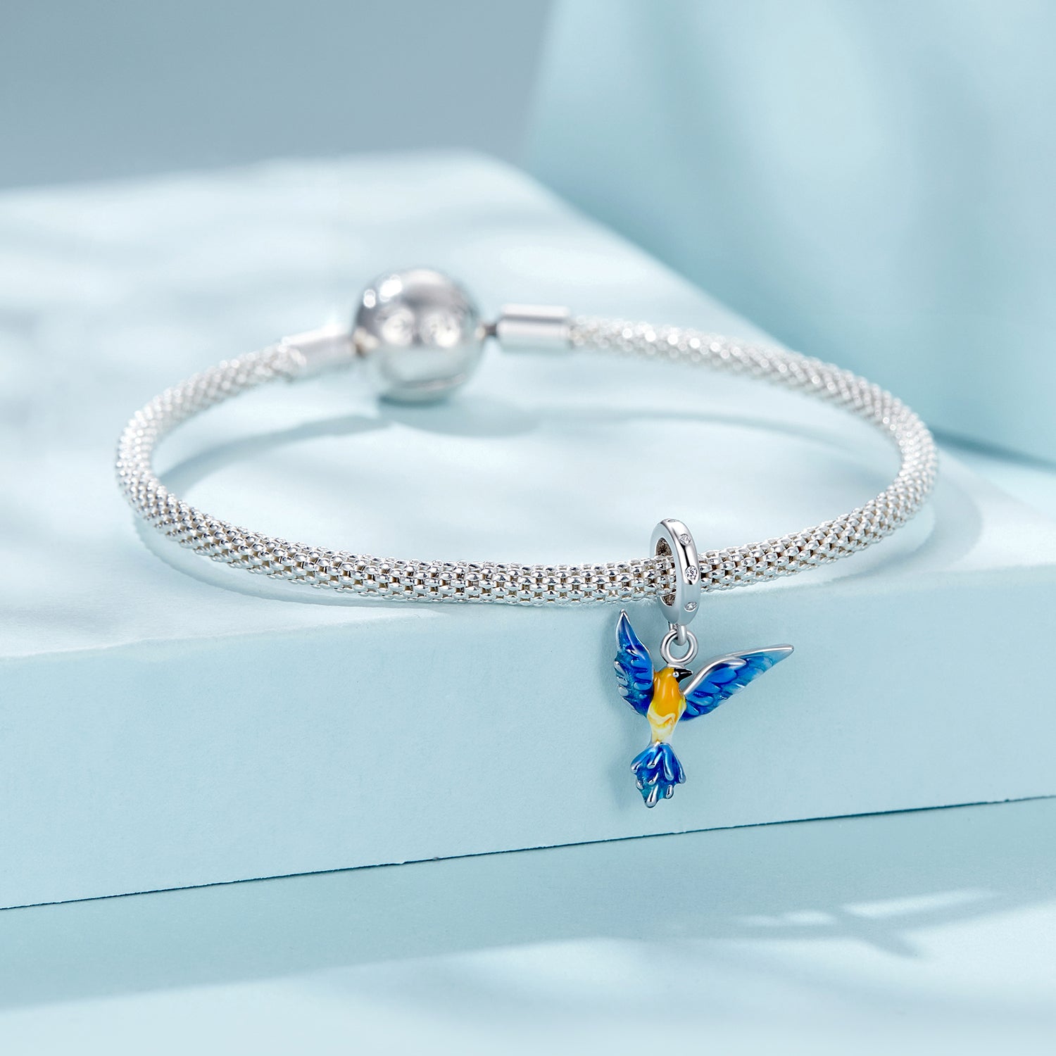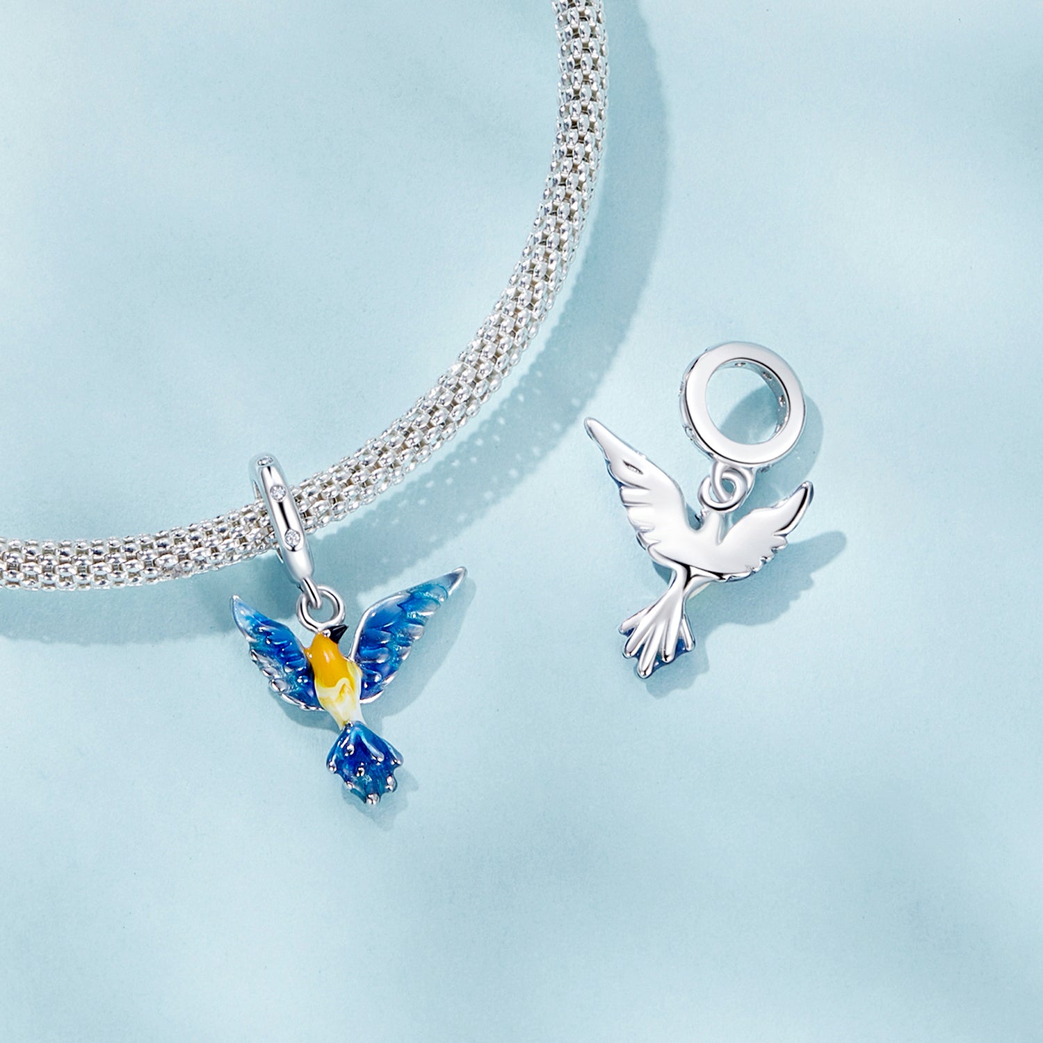 Nápaditý přívěsek ve tvaru ptáka s roztaženými křídly symbolizuje svobodu, lehkost a radost ze života. Ozdobený barevnou glazurou v modro-žlutých tónech a jemnými krystalky na uchycení. Vhodný pro náramky typu Pandora.