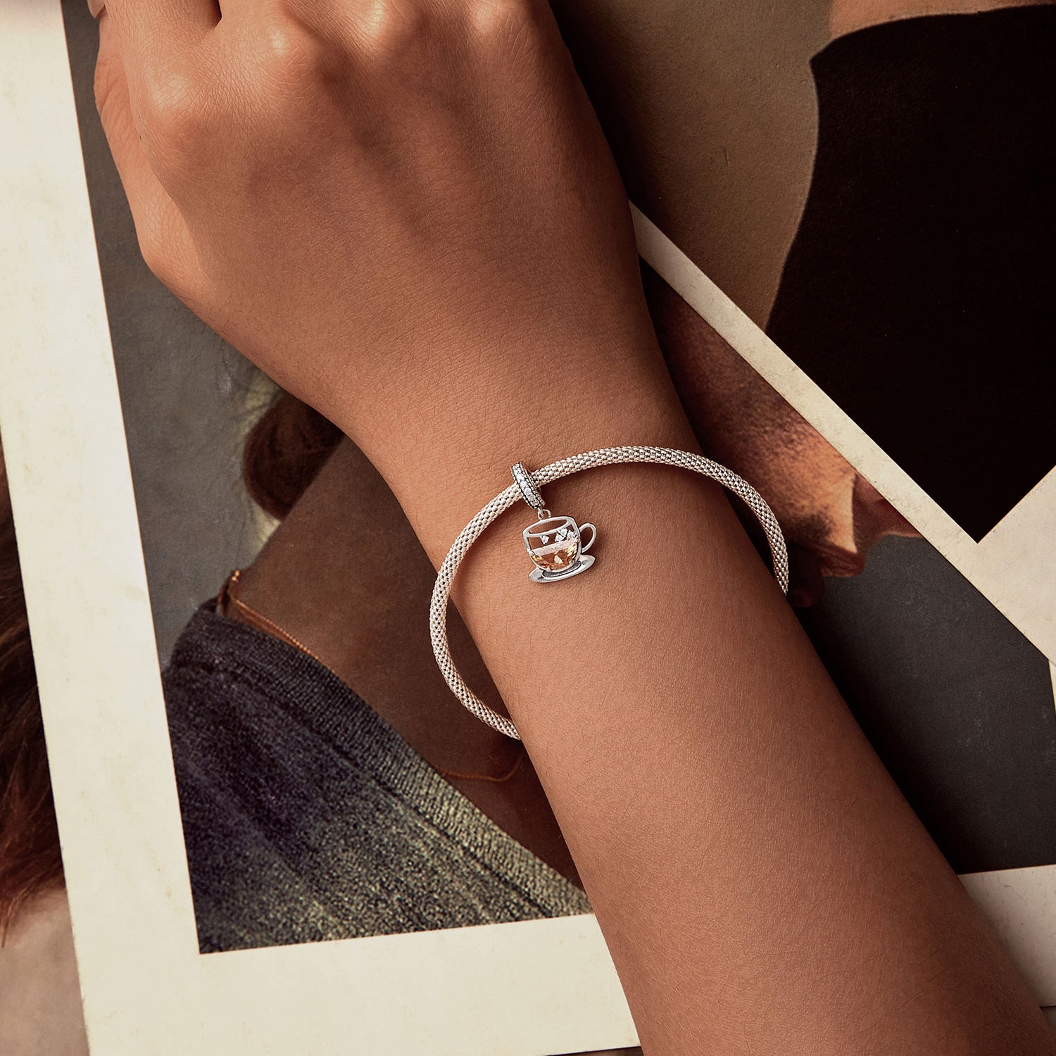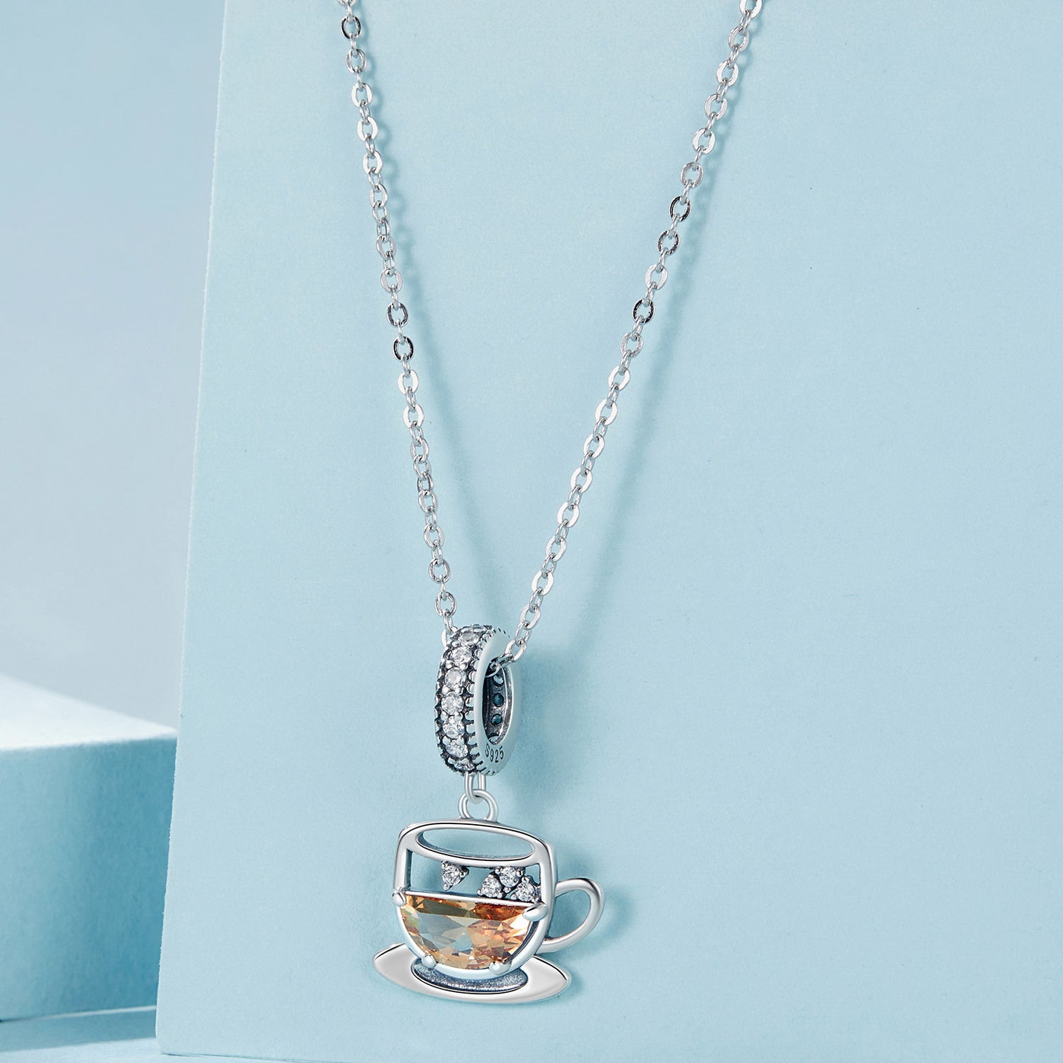 Tento elegantný strieborný prívesok v tvare šálky čaju prináša pocit pokoja a chvíľky pre seba. Trblietavý hnedo-zlatý cirkón predstavuje teplý čaj, zatiaľ čo drobné číre kamienky pripomínajú bublinky či paru stúpajúcu zo šálky. Detaily dodávajú šperku jemný šarm, ktorý poteší všetky milovníčky čaju a pokojných okamihov.
